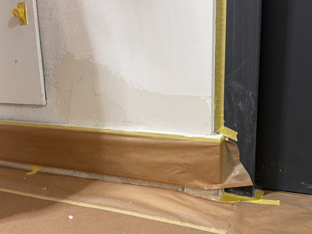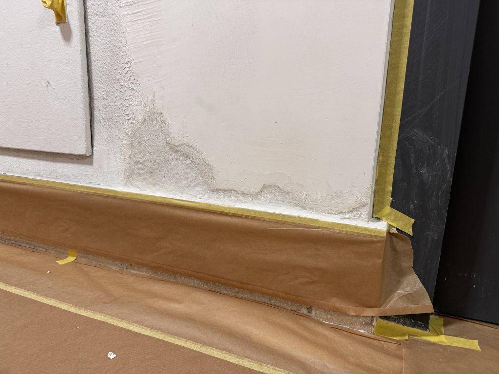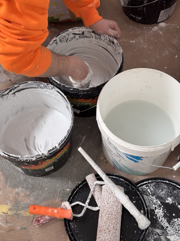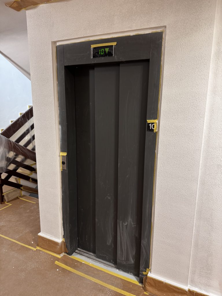 Am Freitag haben wir uns weiter um die gespachtelten Flächen um die Fahrstuhltüren gekümmert. Mobeen hat Korrosionsschutzmittel mit einer Spraydose in die Ecke gesprüht, um Rost vorzubeugen. Anschließend haben wir zusammen die Spachtelflächen grundiert und mit Plaste strukturiert. Diesmal durfte ich auch das Material für die strukturierte Oberfläche anrühren. Damit die Rollstruktur nicht zu spitz wird, muss das Material mit Wasser verdünnt werden. Dafür wird ein guter Schuss Wasser mit der Hand in die puddingartige Masse „einmassiert“, bis es homogen wird. Anschließend kann man sich die Hände im Wassereimer wieder reinigen. Es hat überraschend lang gedauert, bis das Wasser eingerührt war. Sehr interessant. Nachdem noch ein paar Türzargen mit Gips verfugt wurden, war Feierabend.