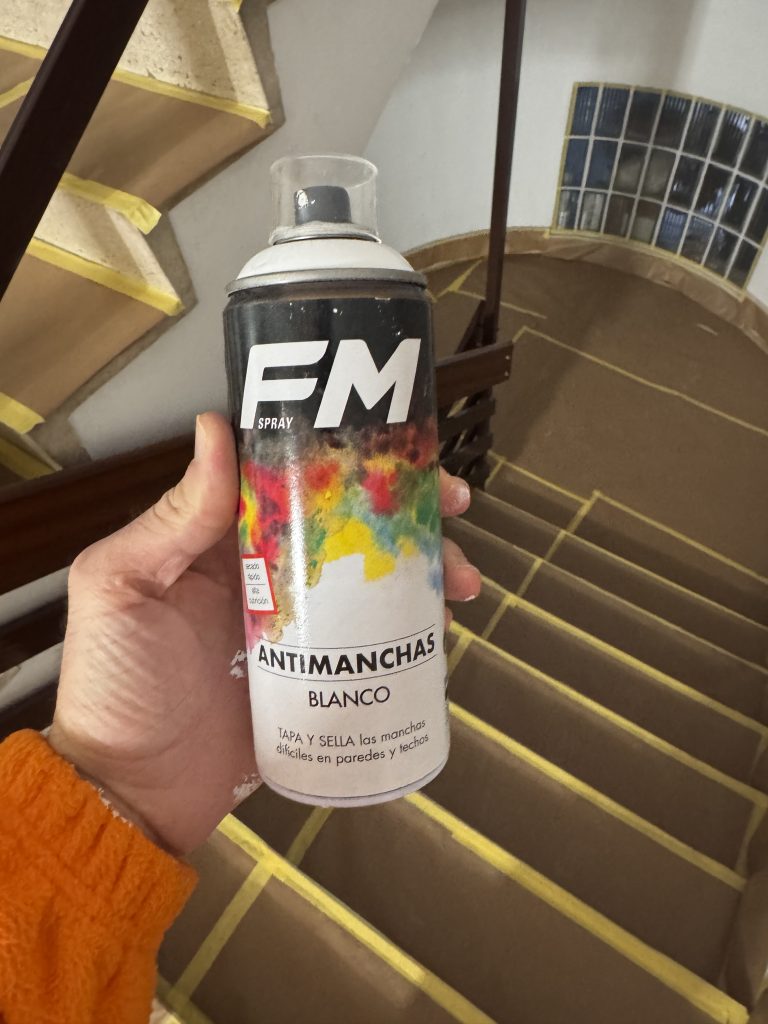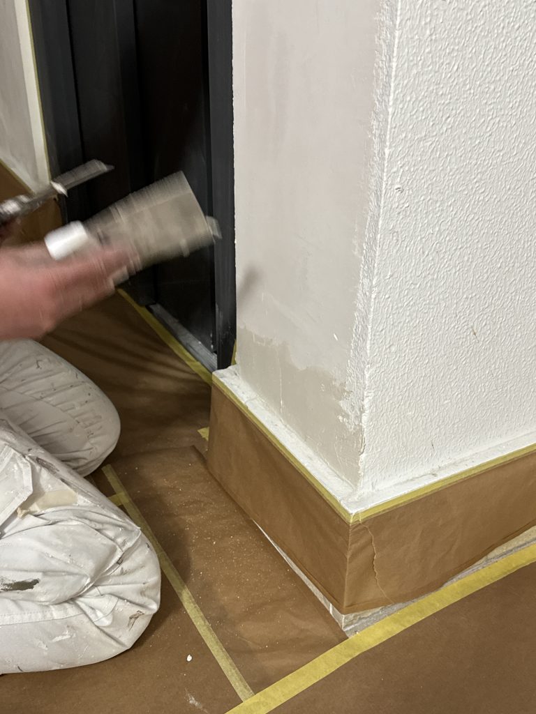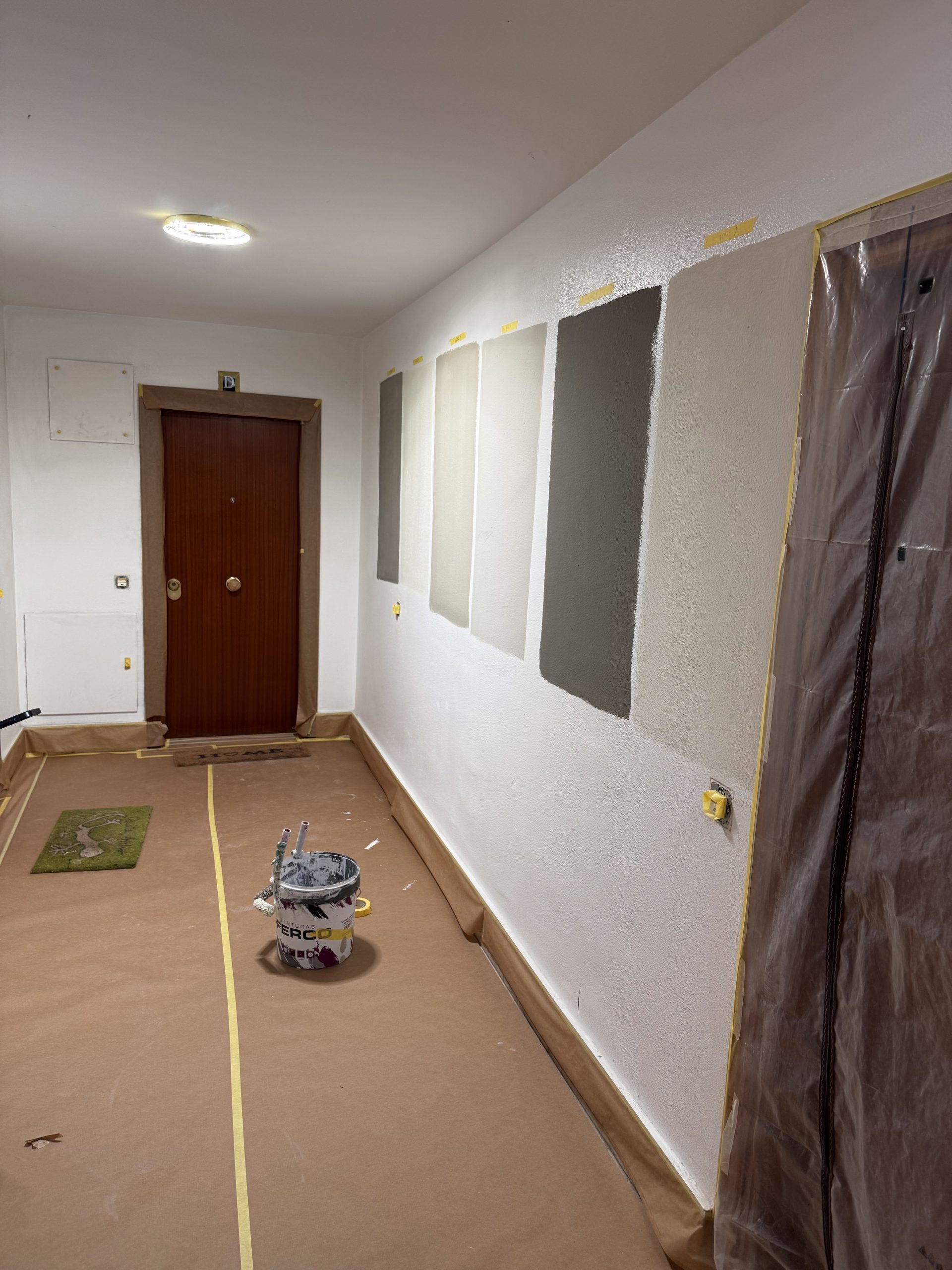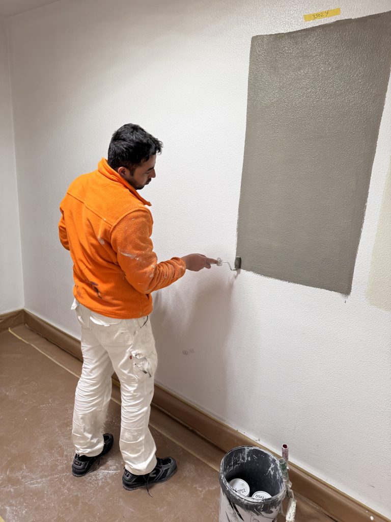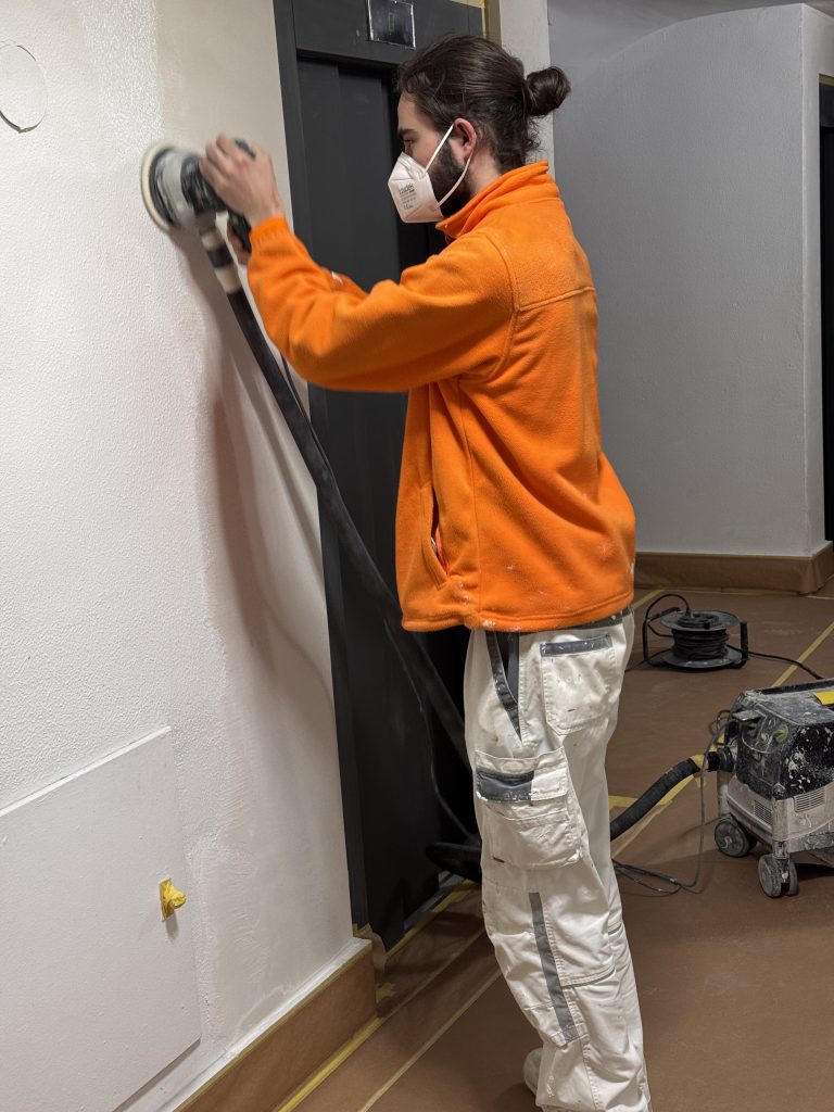 Es ist bereits Donnerstag und wir haben uns mit den Abdeckarbeiten stetig nach unten durchgearbeitet. Jetzt fehlten nur noch Etage 1-3, die wir noch vor der Mittagspause fertiggestellt haben. Nachdem das erledigt war, haben wir mehrere kleine Farbtöpfe in Joghurtbechergröße nach unten in den zweiten Stock gebracht und die verschiedenen Farbtöne in regelmäßigen Abständen aufgetragen. Das Ergebnis soll als Muster für den Architekten dienen, damit er den richtigen Farbton auswählen kann. Spannend, dass der Farbton erst jetzt endgültig ausgewählt wird, und nicht bereits im Kundengespräch. Anschließend haben wir ein paar Spachtelarbeiten überhalb der Fußleiste ausgeführt und durchgetrocknete Spachtelstellen mit dem Exzenter geschliffen. Und dann neigte sich der Tag schon langsam dem Ende zu…