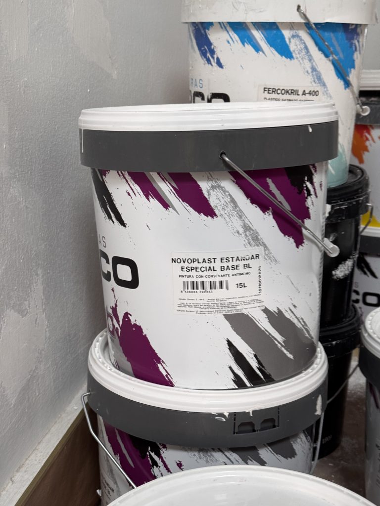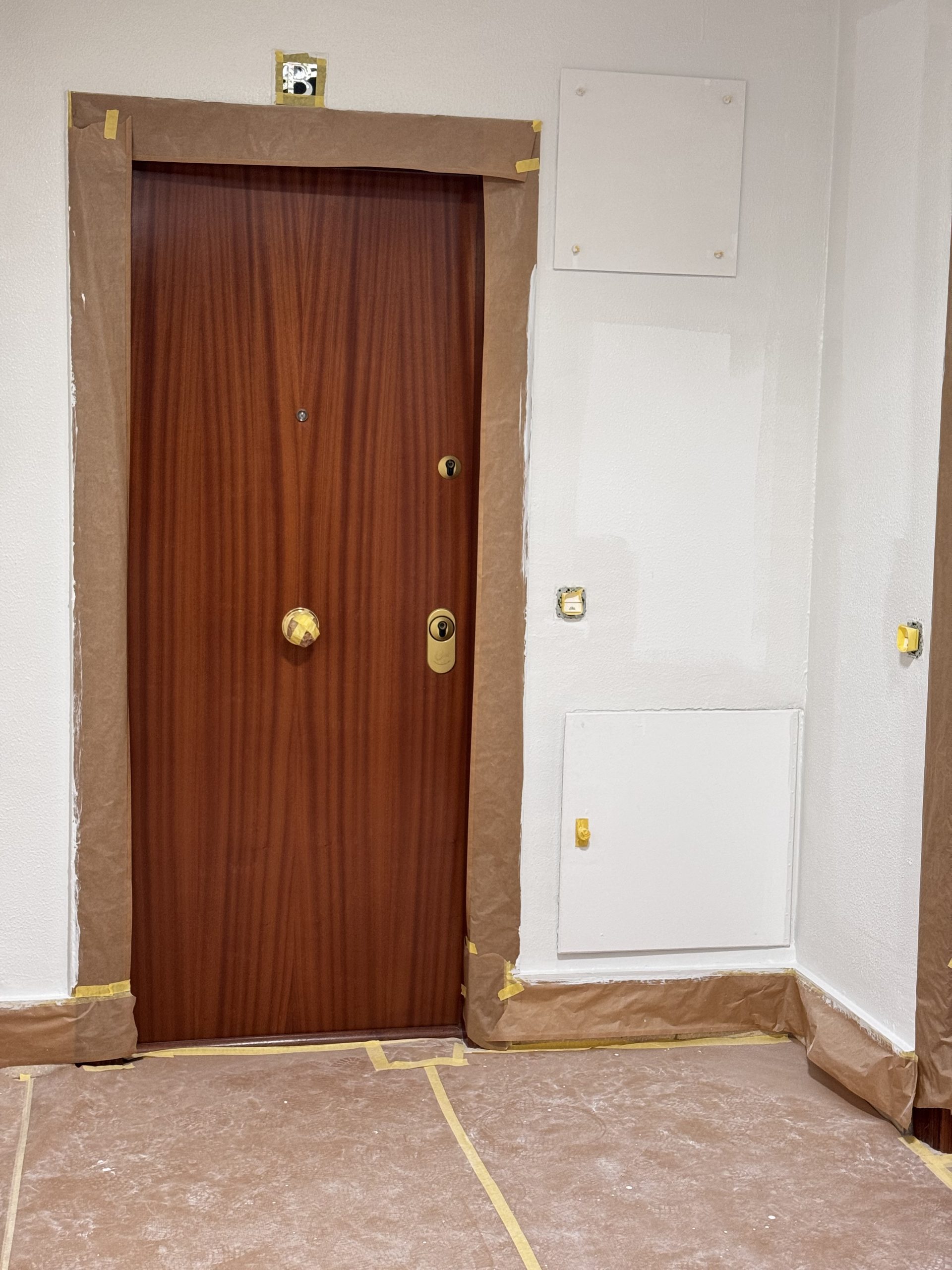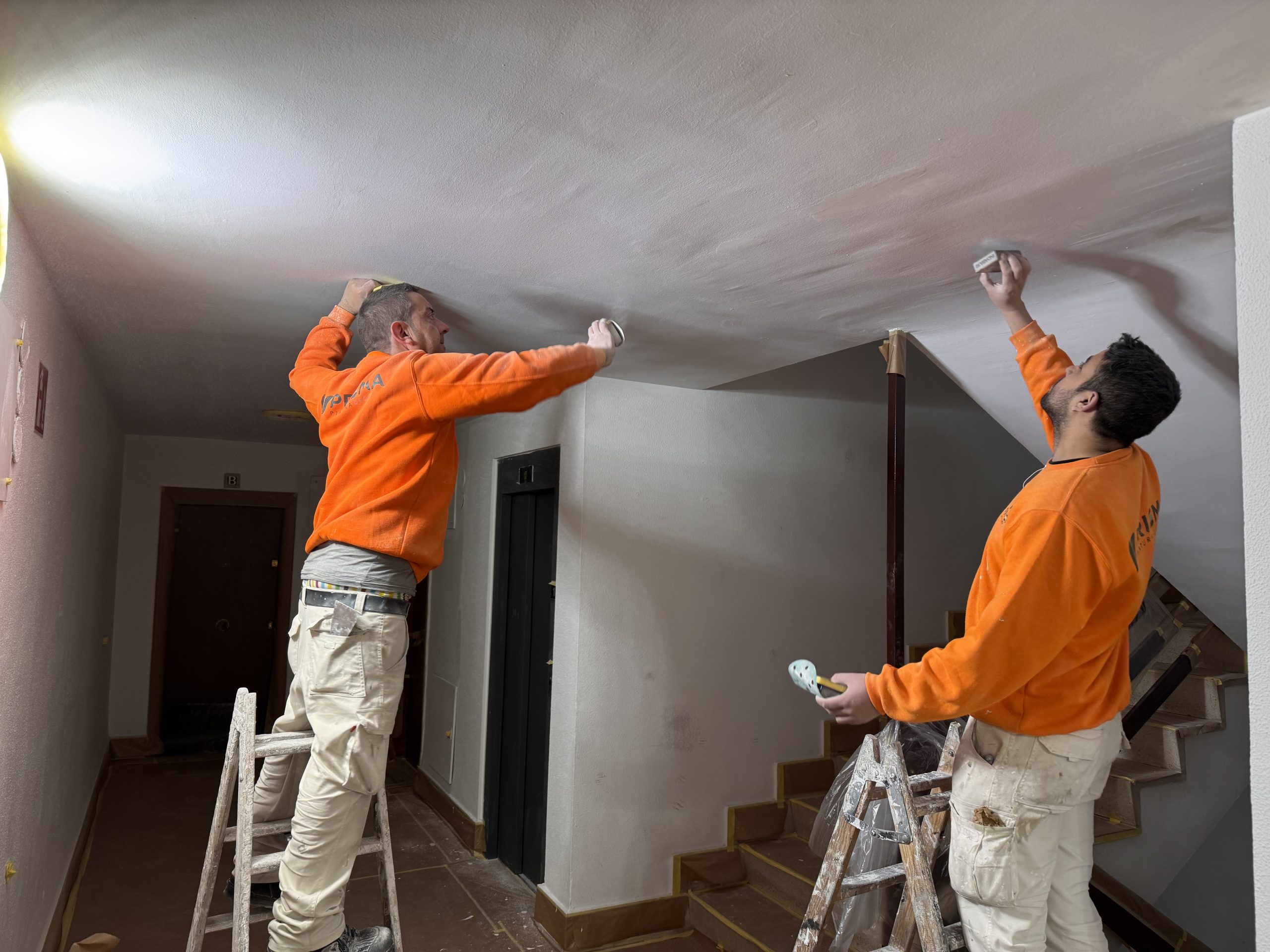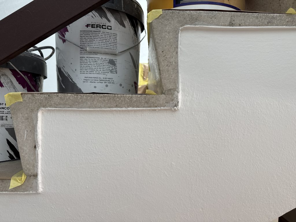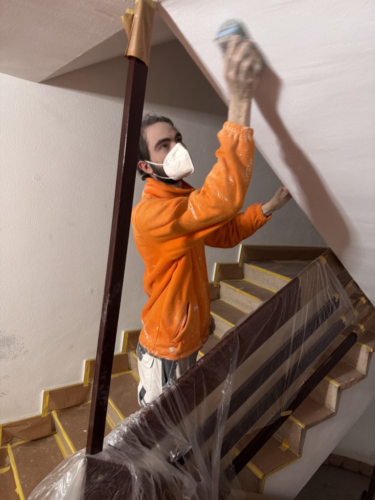 Die Spachtelstellen von letzter Woche stehen als erstes an und müssen geschliffen werden. Zunächst einmal haben wir es mit der Deckenschleifgerät probiert, doch das ging überhaupt nicht gut aus. Die Altbeschichtung hat beim Schleifen so stark gestaubt, dass Mobeen förmlich in einer weißen Wolke verschwand, und das trotz Absaugung! Dann doch lieber mit der bewährten Methode per Hand:) Danach war alles bereit fürs streichen. Ganz nach der goldenen Regel im Malerhandwerk, dass man immer von oben nach unten arbeitet, ging es wieder im obersten Stockwerk mit dem ersten Deckenanstrich los. Die Decke soll mit einer matten Dispersion und die Wände mit einer Latexfarbe gestrichen werden, beides im selben Farbton. Wir konnten uns die Arbeit gut aufteilen. Zwei Leute streichen mit Pinsel und kleiner Rolle die Kanten und der Dritte rollt mit der großen Rolle zu. Auf die Weise sind wir bereits bis in die 7 Etage runter gekommen, es ging also gut voran.