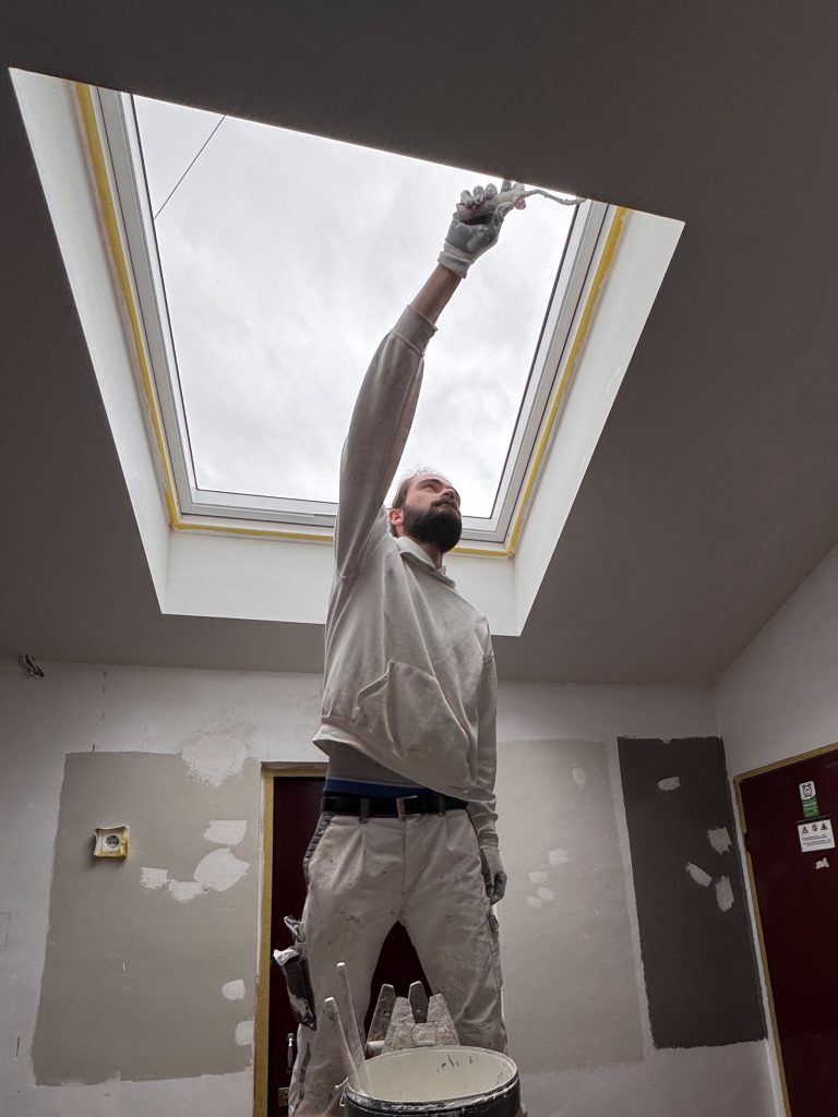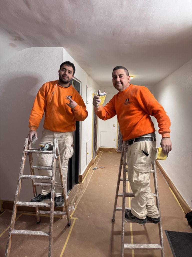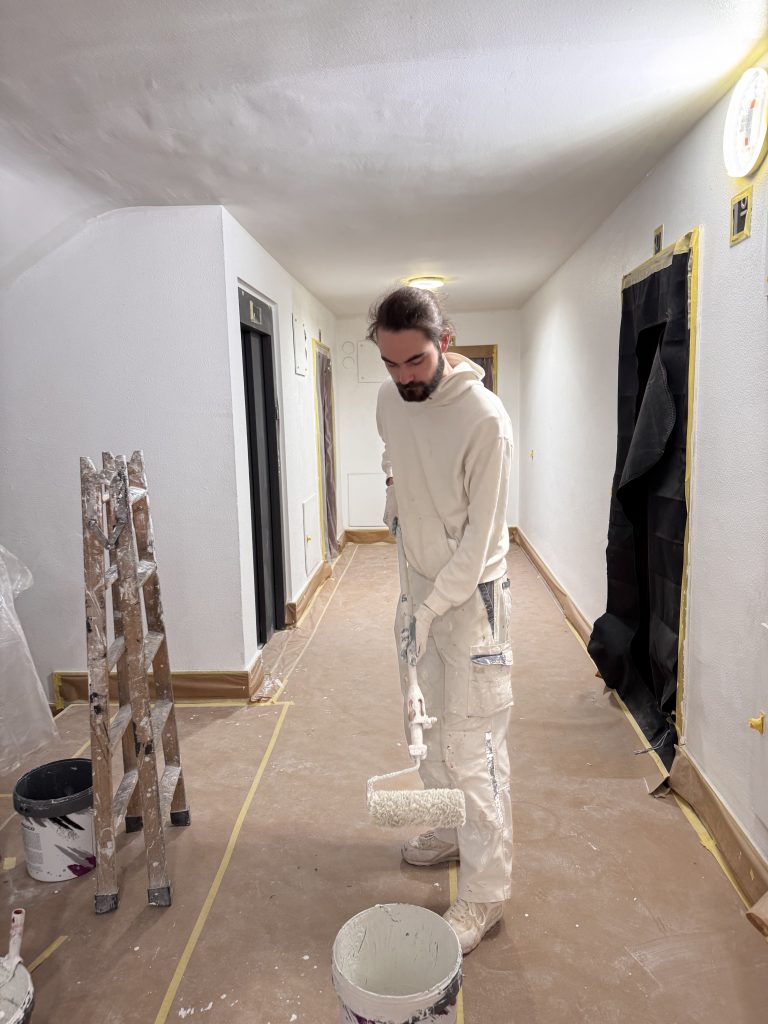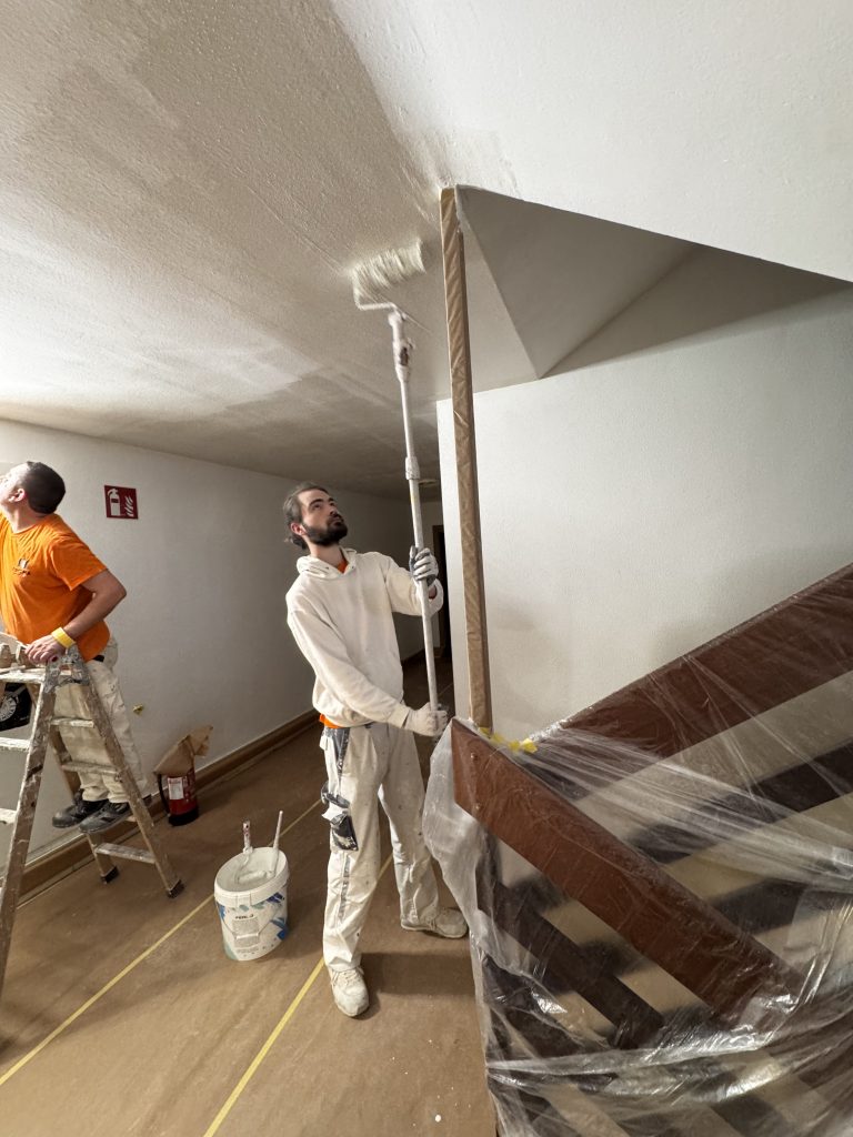 Dienstag ging’s dann weiter mit der Decke. Wir waren ein super eingespieltes Team und haben die Aufgaben auch immer rotiert, sodass man immer etwas Abwechslung hatte und es von der Belastung her nicht einseitig wird. So sind wir tatsächlich um 2 Uhr schon fertig mit dem ersten Anstrich und sind wieder hoch in den 10ten Stock für den zweiten Anstrich.