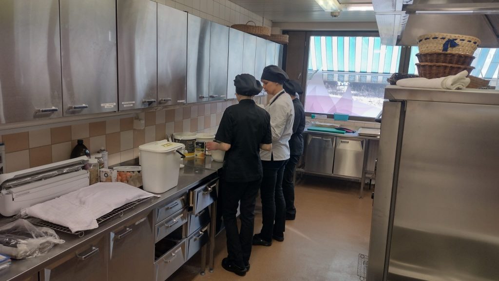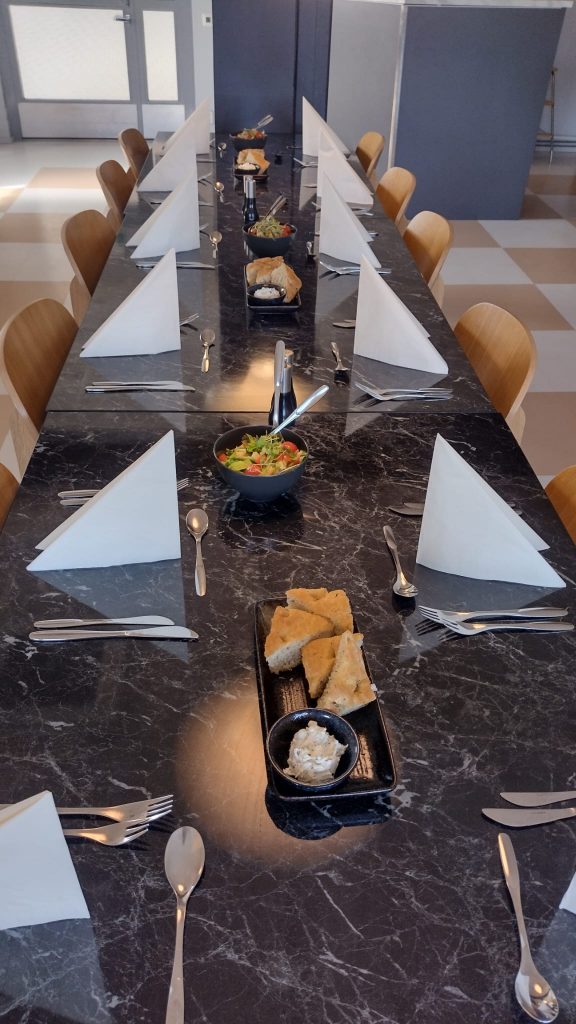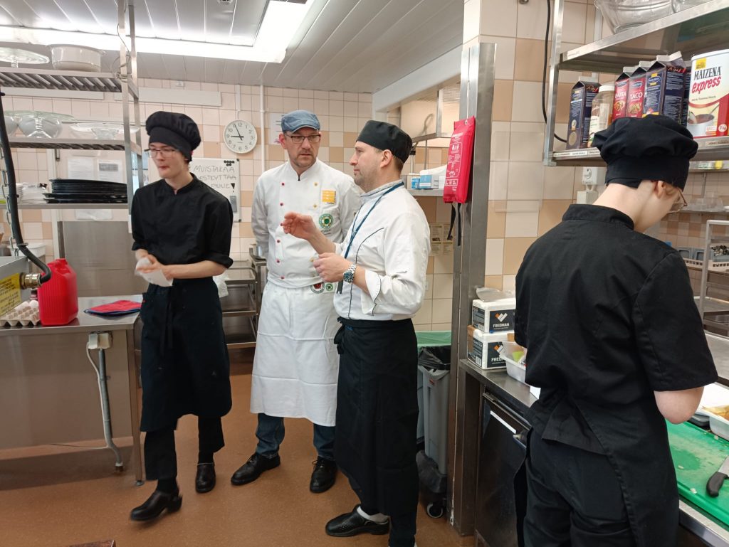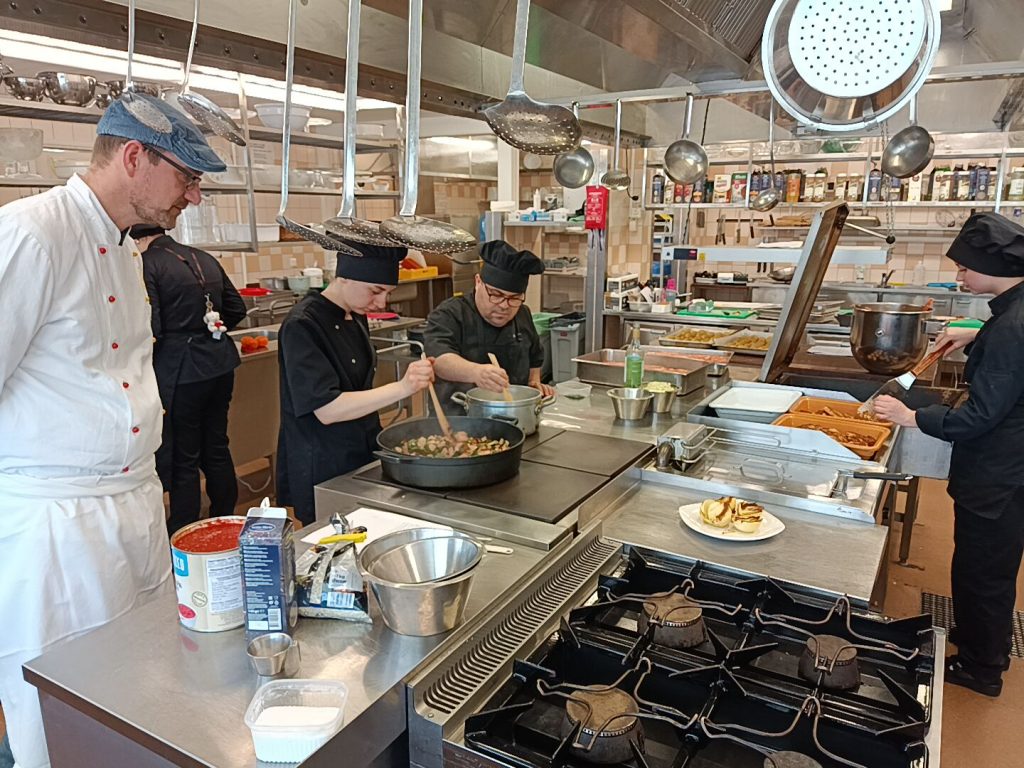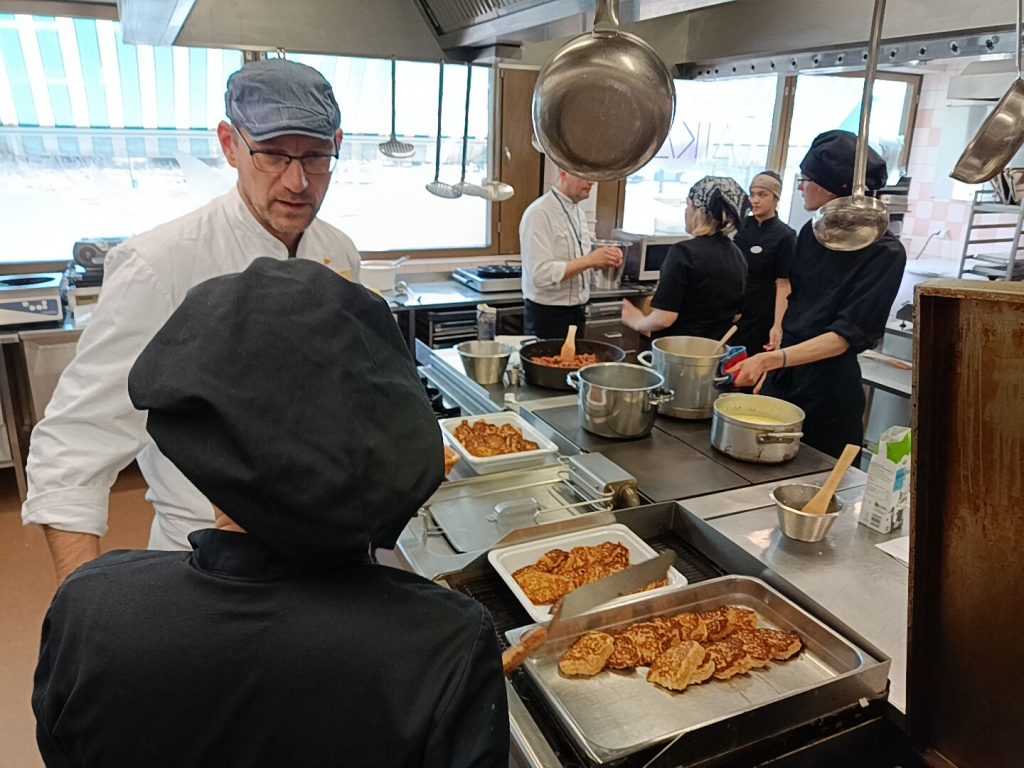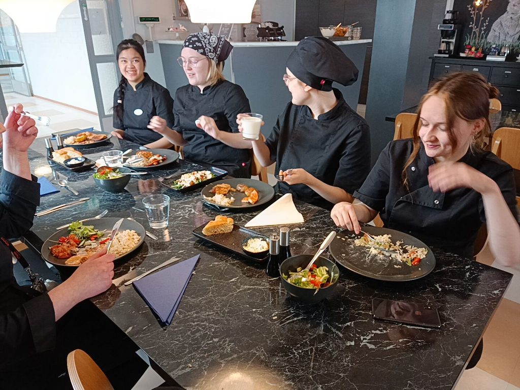 Heute durften wir dem Team des Schulrestaurants Taika über die Schulter schauen und sehen wie die Klasse des ersten Ausbildungsjahres mit Schüler*innen des dritten Ausbildungsjahres eine Kombination aus Buffet und Menü für ca. 30 Gäste hergestellt hat.