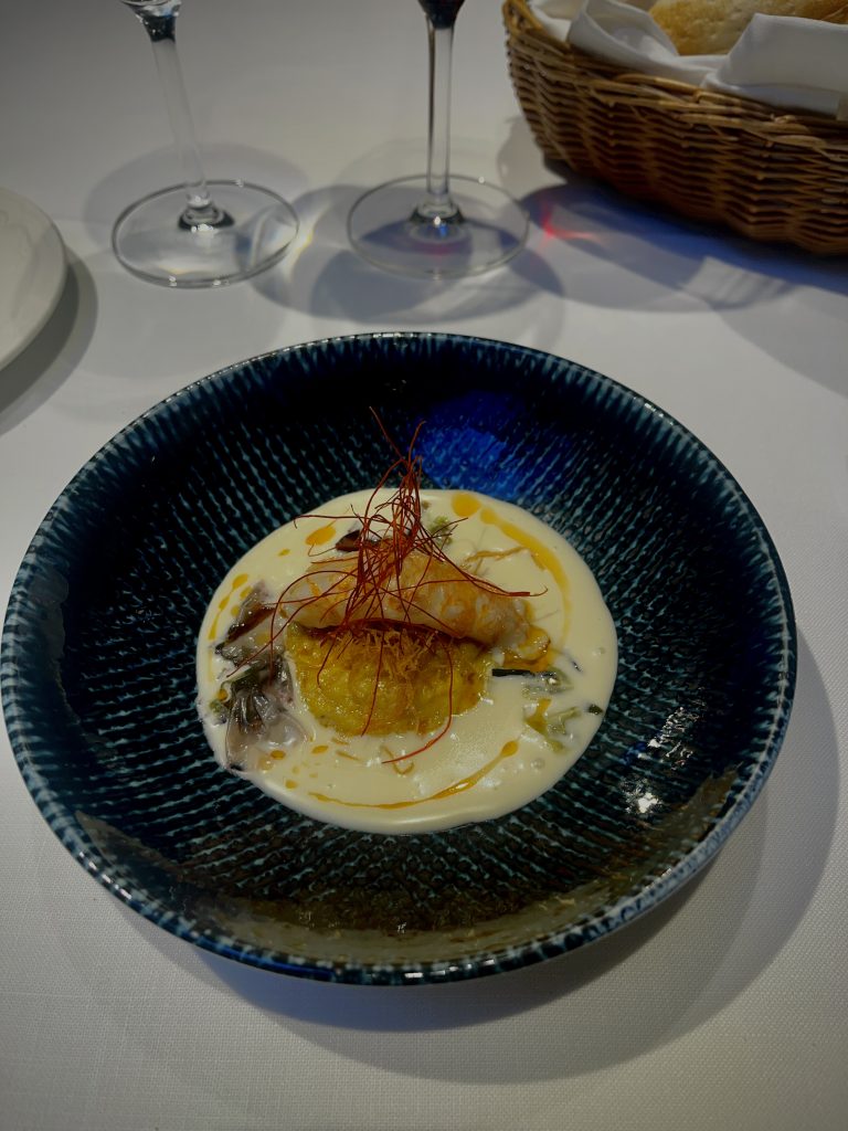 • Gazpachuelo mit Tarama, Langustine und Algenmix – Eine feine Meeresnote mit einer cremigen Konsistenz.