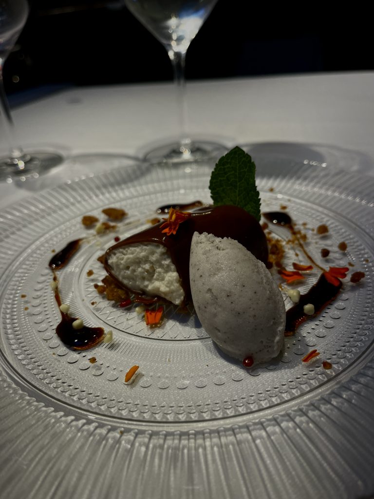 • Canelón de cacao mit Käsemousse, Trüffeleis und Walnusscrumble – Ein Traum für Schokoladen- und Käseliebhaber.