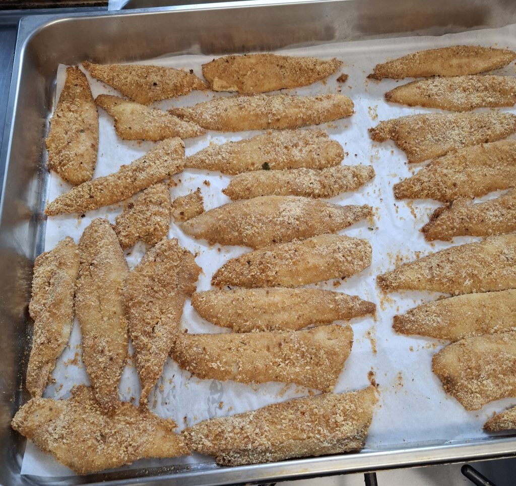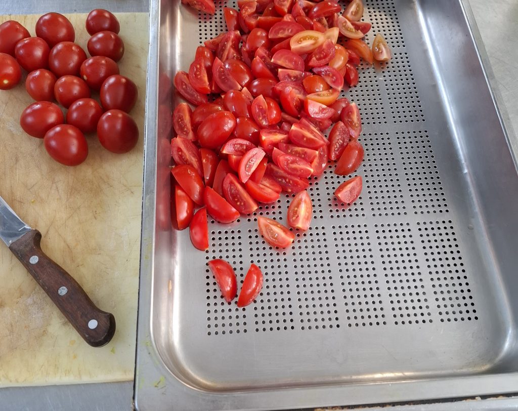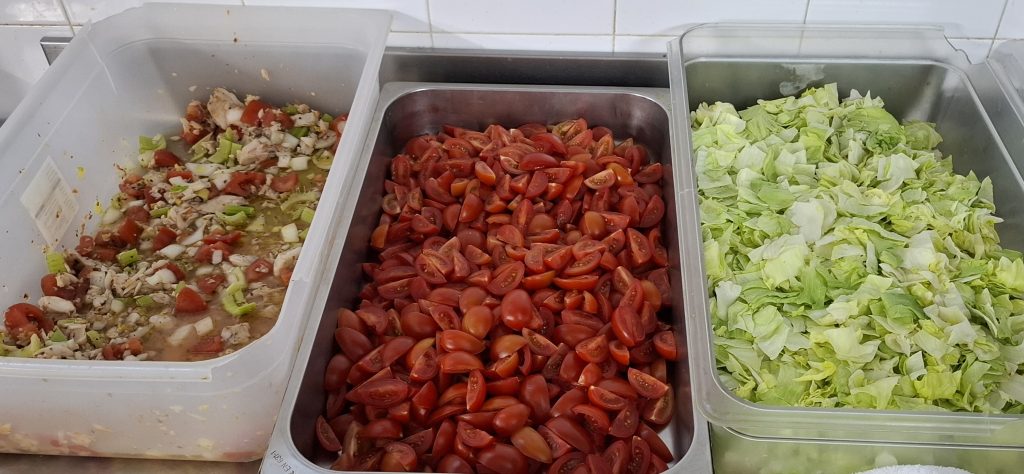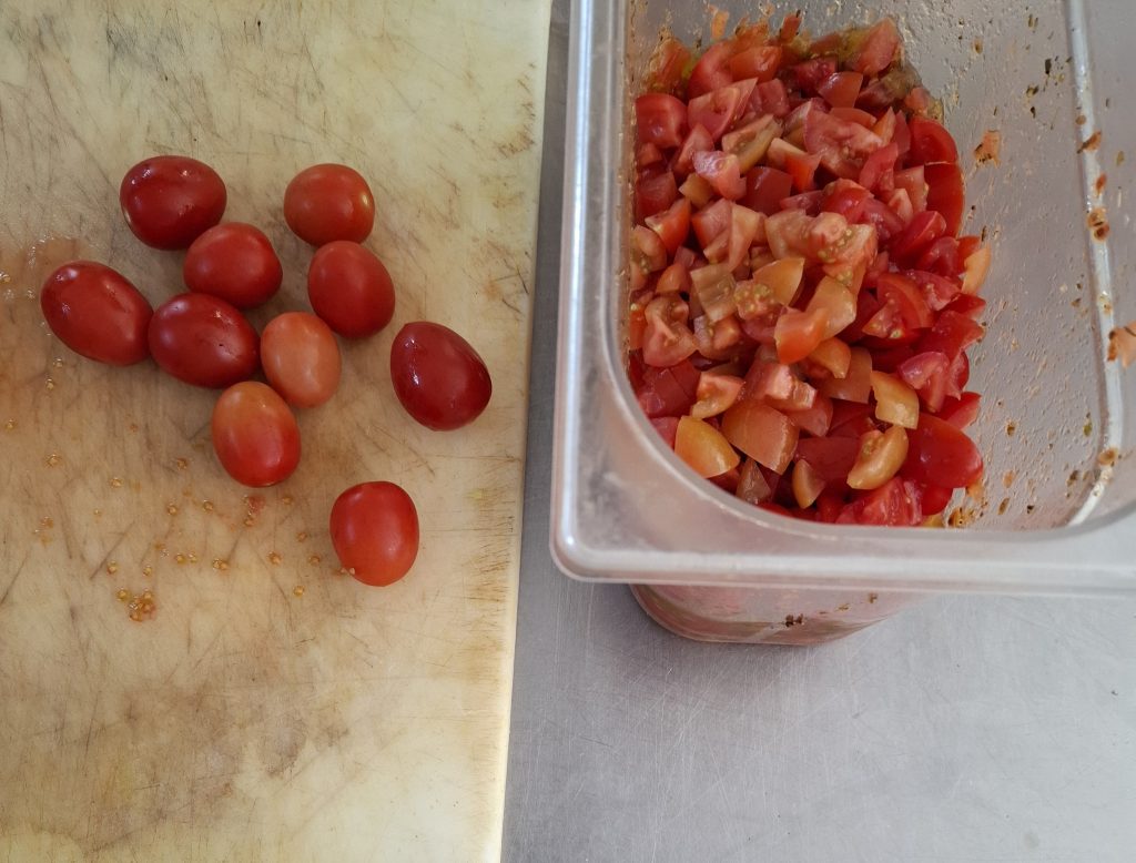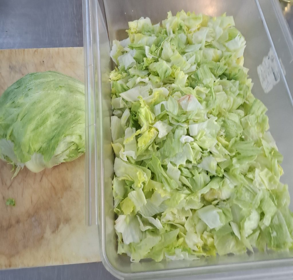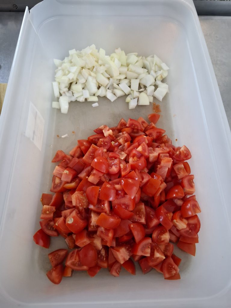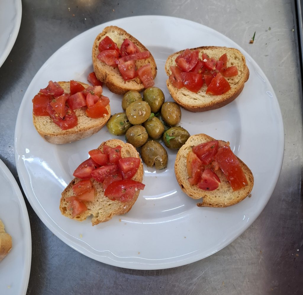Unser Tag begann um 11:00 Uhr und dauerte bis 14:30 Uhr, bevor wir abends von 19:00 bis 22:00 Uhr wieder im Einsatz waren. Zuerst schnitten wir Tomaten und schälten Zwiebeln, bevor wir den Eisbergsalat klein hackten. Danach bereiteten wir Bruschetta mit frischen Tomaten und Oliven vor – eine Aufgabe, die uns immer leichter von der Hand geht.