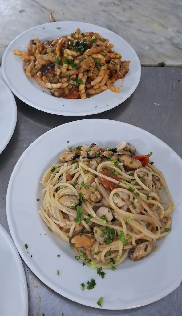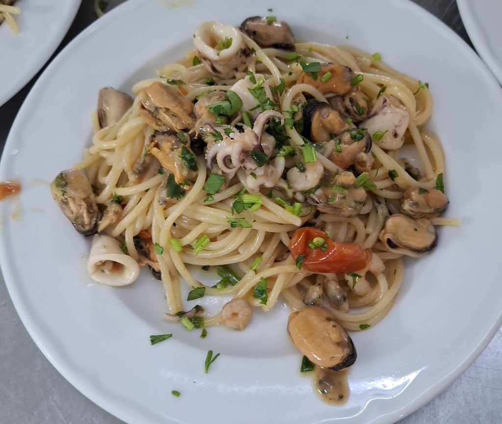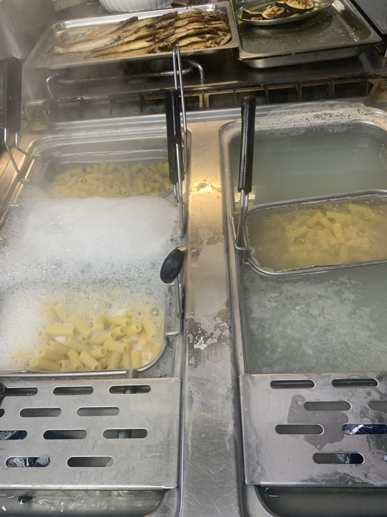 Im Anschluss servierten wir auf Abruf verschiedene Nudelgerichte mit unterschiedlichen Soßen. Danach folgten gebratener Fisch mit Zitrone, Schnitzel mit Pommes, Eisbergsalat sowie reine Pommes – je nach Bestellung.