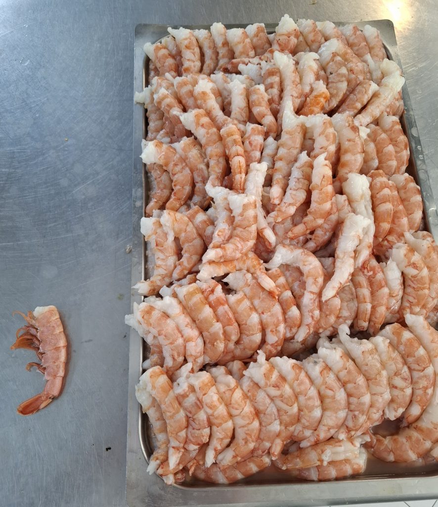 Wir haben zuerst bei den Riesengarnelen den Schwanz und den Panzer entfernt, sie auf ein Blech gelegt und anschließend auf Spieße gesteckt. Danach wurden sie mit etwas Öl beträufelt, in einer Petersilie-Paniermehl-Mischung paniert, auf Bleche verteilt und eingefroren.