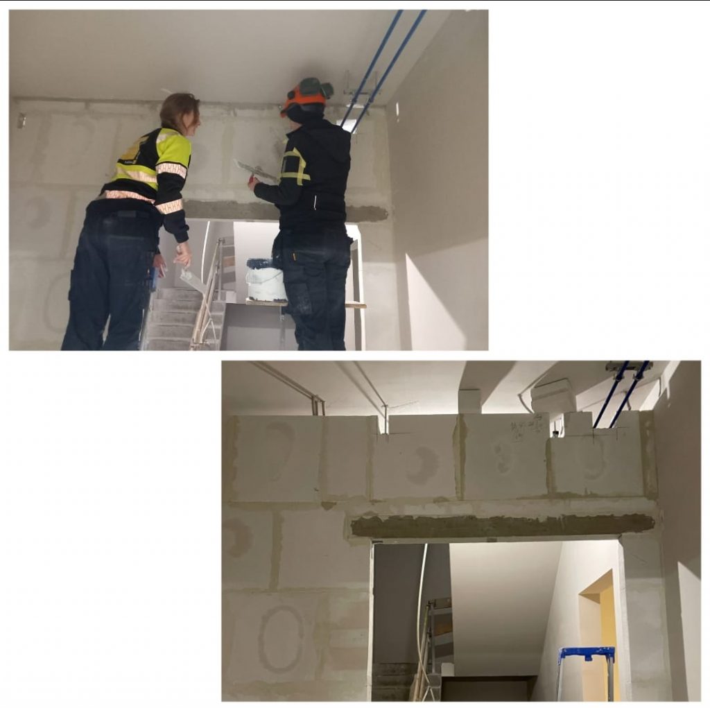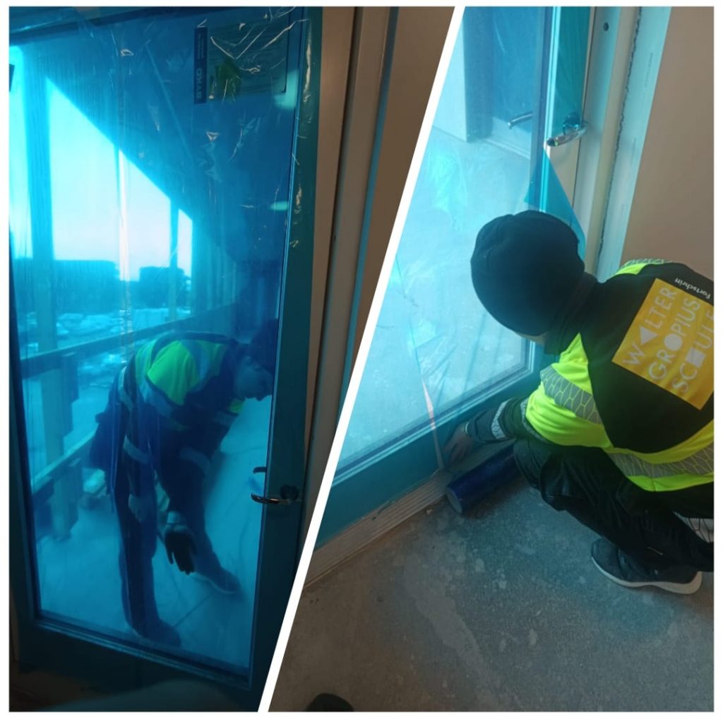 Unser vorletzter Arbeitstag startete mit der Aufgabe die bereits eingebauten Türen mit Folie abzukleben um sie vor Schlagschäden zu schützen.