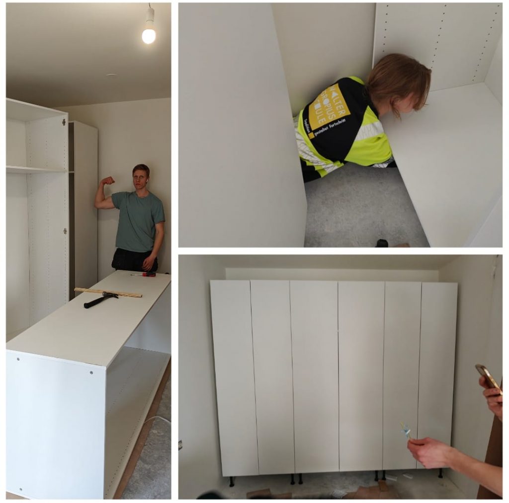 Nach der Mittagspause wurde uns ein Appartement gezeigt in dem wir Möbel aufbauen sollten. Diese musste wir zunächst erst einmal aus der Verpackung holen und dann wie typische Selbstmontagemöbel zusammen bauen und aufstellen. Unter die Schränke haben wir Möbelfüße geschraubt, sie anschließend mit der Wasserwaage ausgerichtet und dann mit einander verbunden.