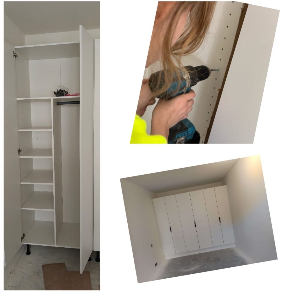 Im Anschluss haben wir die Schränke an der Wand befestigt, die Griffe drangeschraubt und das Innenleben mit den Einlegeböden befestigt.