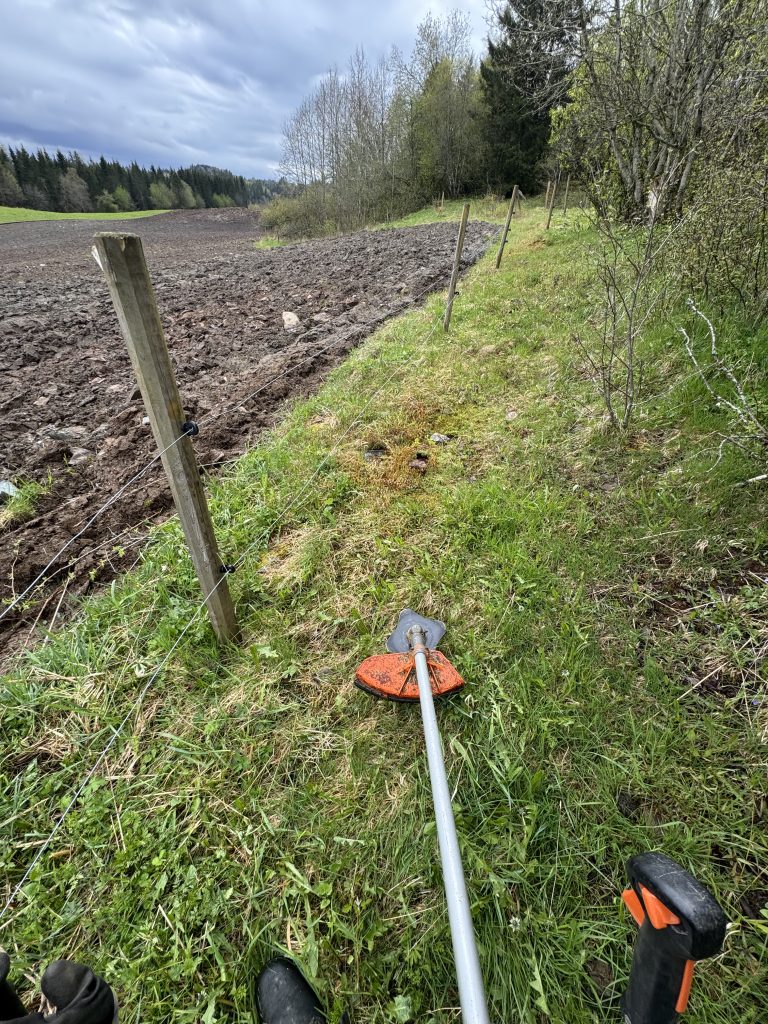 Wie man dem Titel entnehmen kann, kommt langsam der Frühling hervor und die Frühjahrsarbeiten beginnen. Aktuell stehen neben den täglichen Arbeiten im Stall auch Reparaturen an den Zäunen auf dem Tagesplan. Da die Kühe bald auf die Weide sollen, müssen die Zäune natürlich repariert, kontrolliert und freigeschnitten werden, damit sie Strom leiten. Das war in den letzten Tagen unsere Aufgabe. Felix war fast jeden Tag mit dem Mitarbeiter Vegad unterwegs. Meine Aufgabe war es, die Pfähle zu kontrollieren und gegebenenfalls mit Steinen in der Erde zu befestigen, damit sie nicht wackeln und standfester sind. Zwischendurch habe ich mit dem Freischneider die Zäune freigeschnitten.