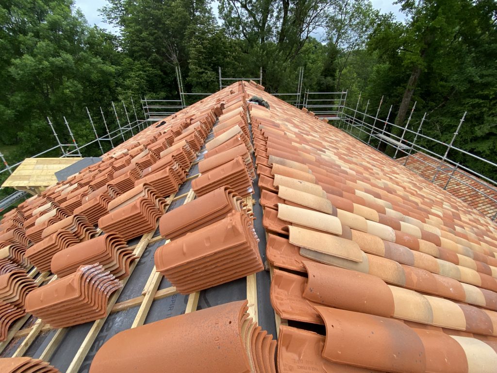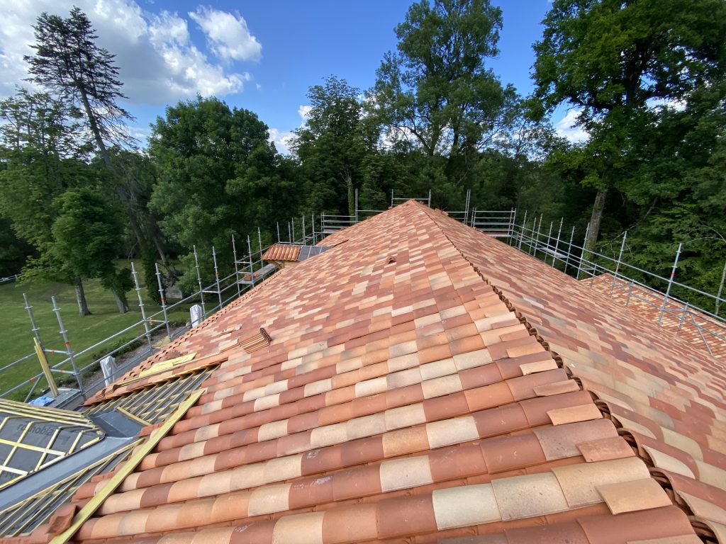 Gedeckt wurde das Dach mit sogenannten Mönch-und-Nonne-Ziegeln, auch Klosterziegel genannt – eine historische Art der Dacheindeckung, die perfekt zum Schloss passt. Zuerst wird der Nonnenziegel, eine halbrunde Schale, mit der Öffnung nach oben auf die Traglattung gehängt. Bei uns wurde jede dritte Reihe zusätzlich verschraubt, um den Halt zu verbessern.