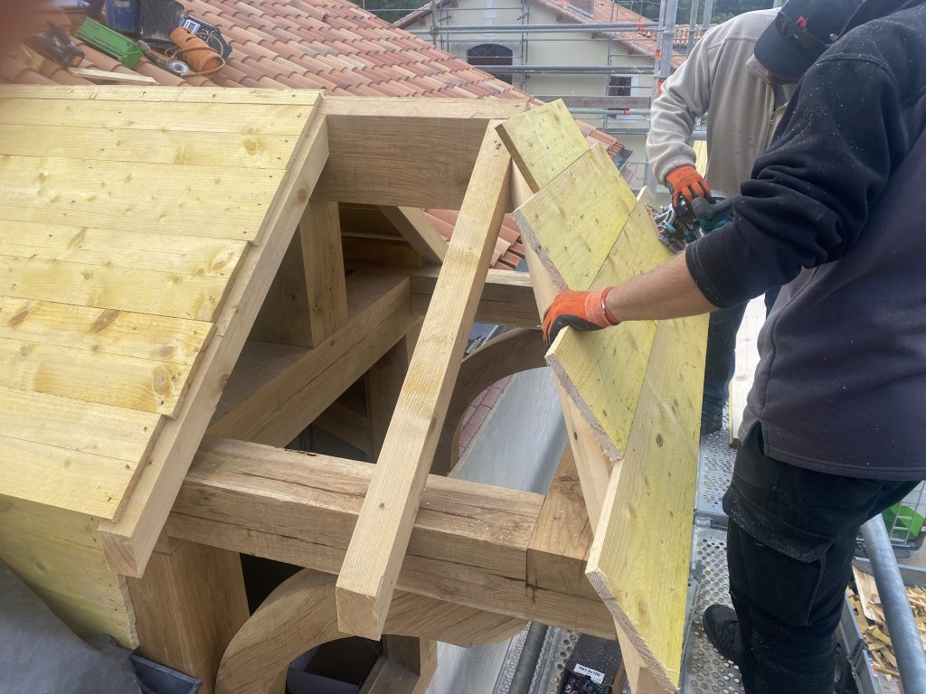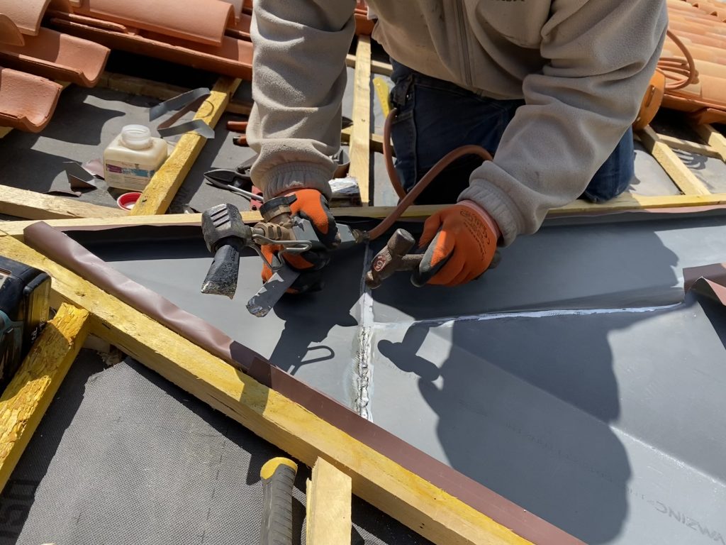Zum Schluss ging es noch darum, das Regenwasser in geordnete Bahnen zu lenken. Ich durfte meinem Kollegen Joséf zur Hand gehen, der diese Aufgabe mit bewundernswerter Routine erledigte. Metallplatten wurden genau abgemessen, winklig gebogen, zugeschnitten, festgenagelt und sogar gelötet – ein kleiner Ausflug in die Blechbearbeitung, der mir völlig neue Einblicke in das Dachhandwerk verschaffte.