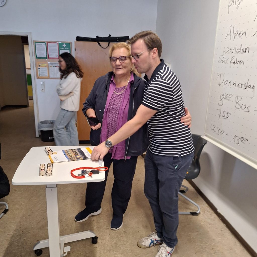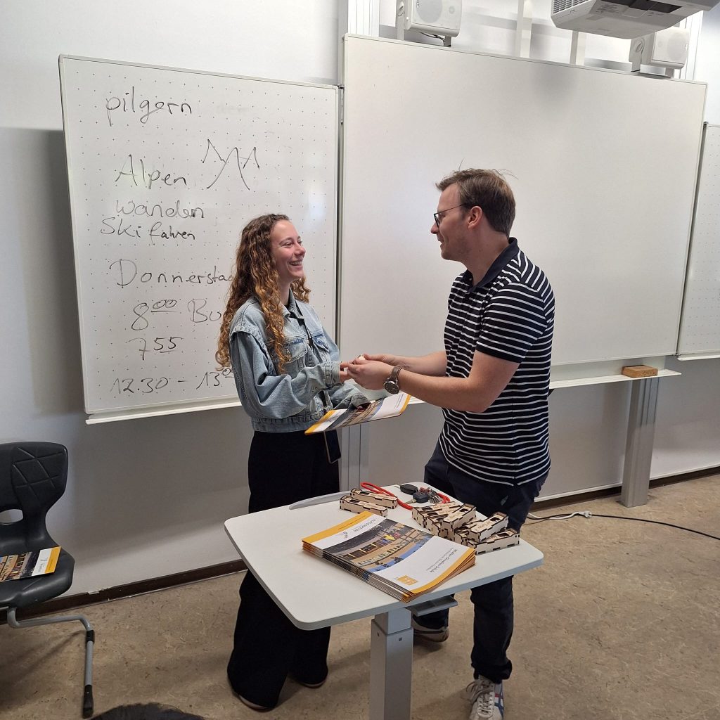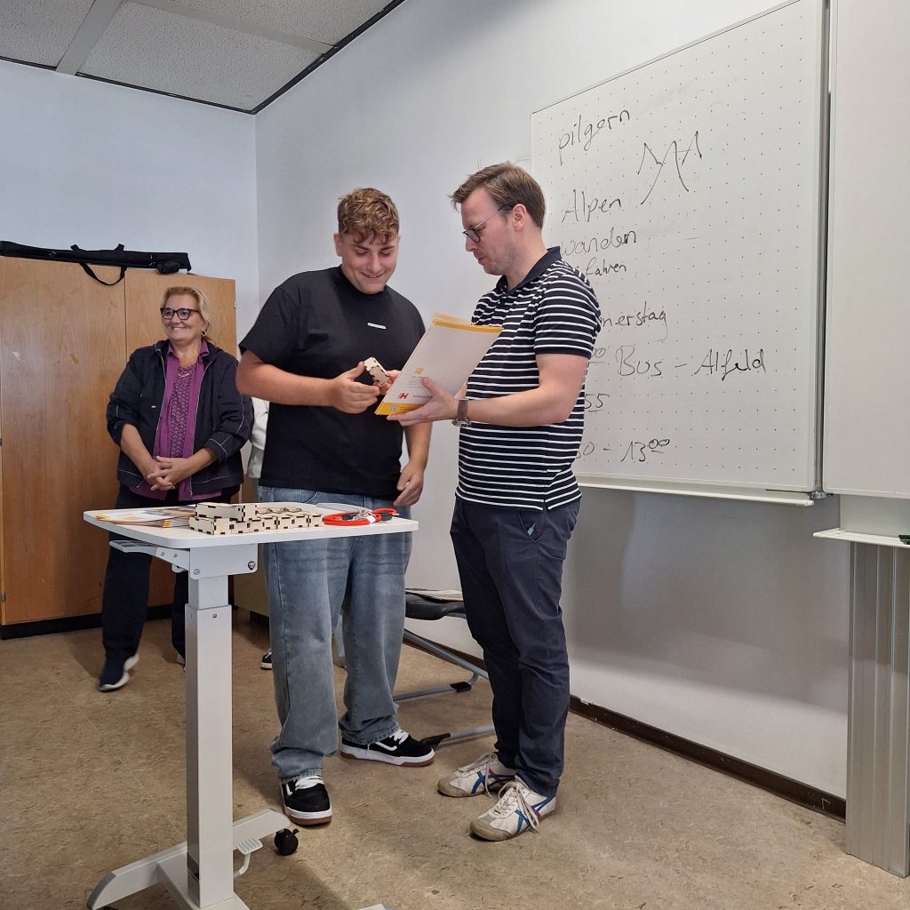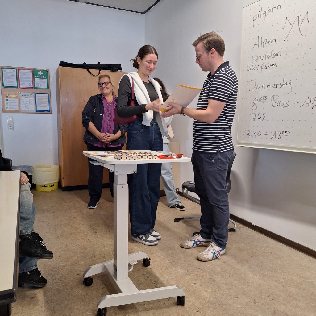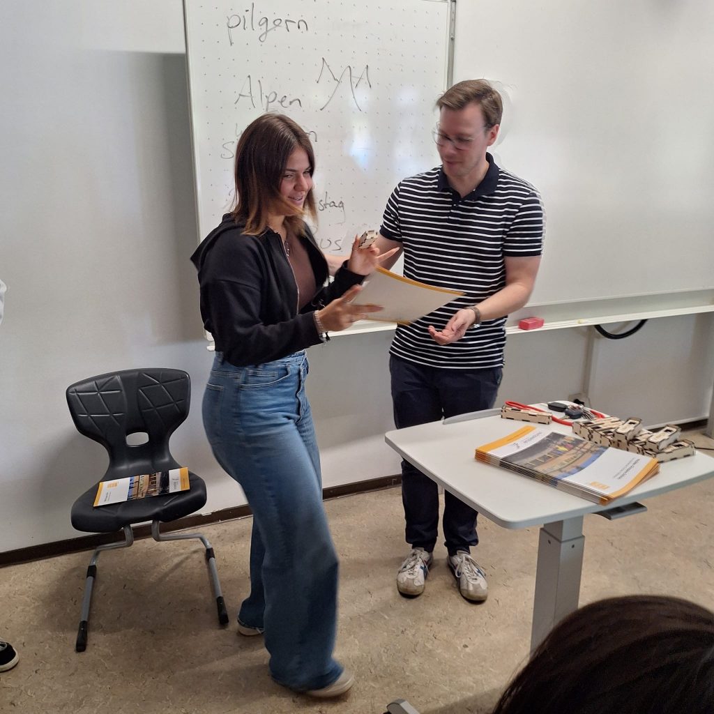 Zum Abschluss gestalteten wir gemeinsam mit der G12A noch ein Begegnungsprogramm: Bei einem Kennenlern-Bingo, das Frau Preuß anleitete, hatten die Schülerinnen und Schüler die Gelegenheit, sich auf eine spielerische Weise von einer ganz neuen Seite kennenzulernen. Anschließend überreichten wir unseren Gästen ein Zertifikat für die erfolgreiche Teilnahme an der Gruppenmobilität, verbunden mit einer kleinen süßen Überraschung. Ein gemeinsames Abschiedsfoto vor der Schule durfte natürlich nicht fehlen. Besonders schön war, dass sich die Gruppen am Ende nur ungern trennen wollten – ein Zeichen für die vielen wertvollen Kontakte und Freundschaften, die in dieser Woche entstanden sind.