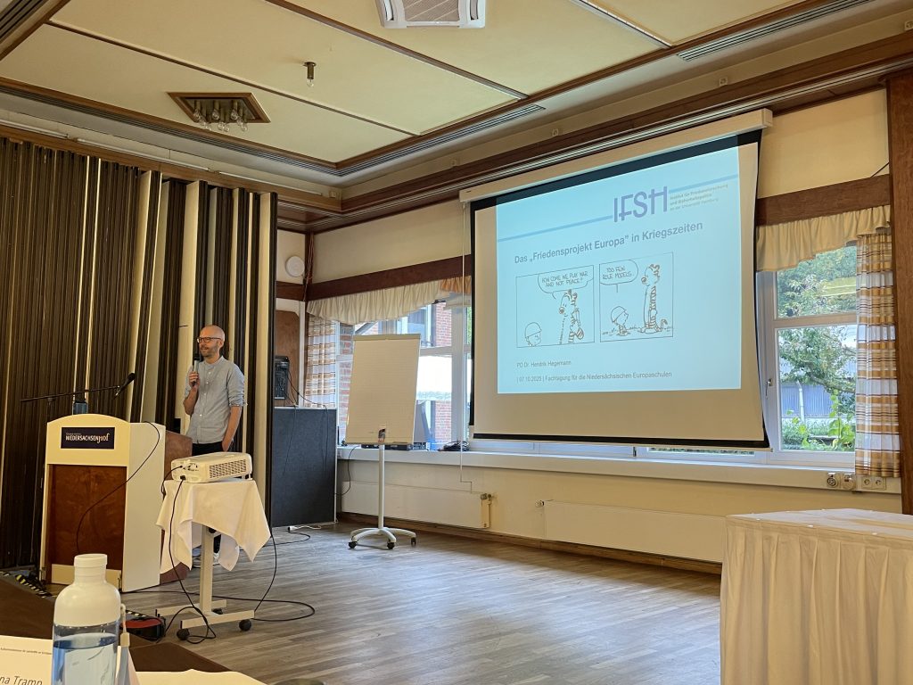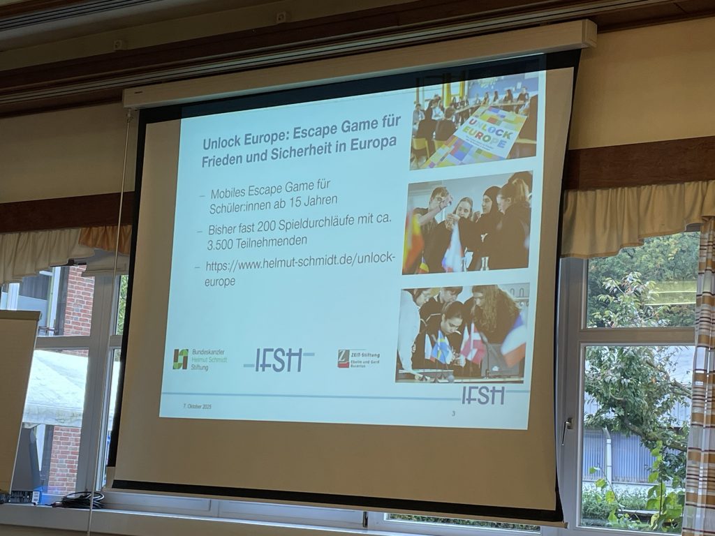 Nach der Begrüßung durch Tanja Störmer-Mautz (Leiterin des Referats 21 im MK) und einer Einführung durch die Tagungsleitung Katja Hemmer (MK) und Jan Marek Sievers (NLQ), eröffnete Dr. Hendrik Hegemann vom Institut für Friedensforschung und Sicherheitspolitik die Tagung mit einem Impulsvortrag. Sein Beitrag beleuchtete, wie das europäische Friedensprojekt angesichts globaler Krisen und aktueller Kriege neu gedacht und gestärkt werden kann. Unter anderem berichtete er von neuen Konzepten wie einem Escape Game für Frieden und Sicherheit in Europa – Unlock Europe. Ein Format das von den Schulen angefragt und gebucht werden kann.