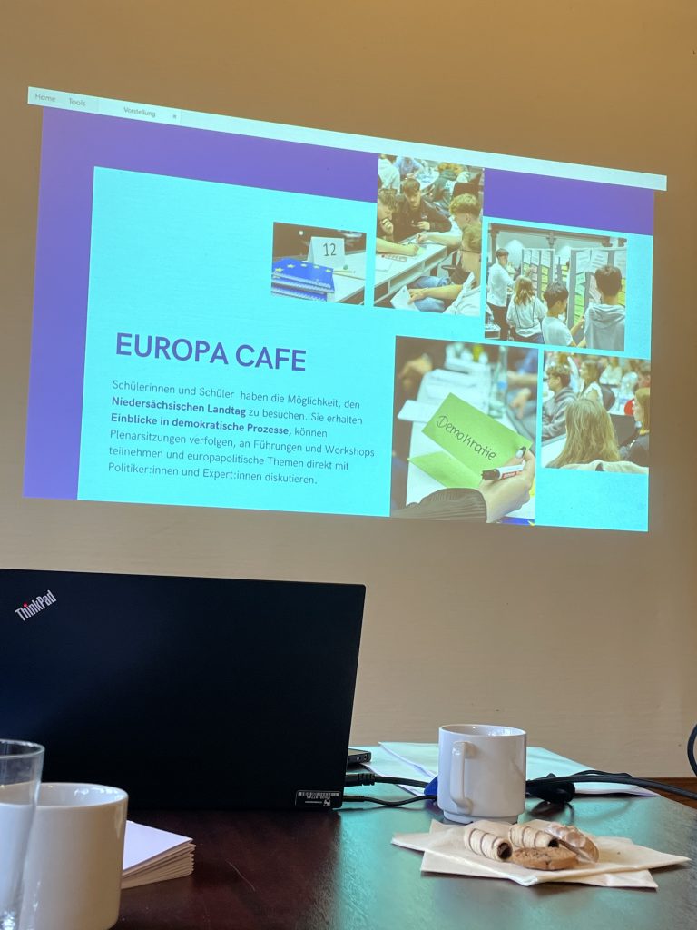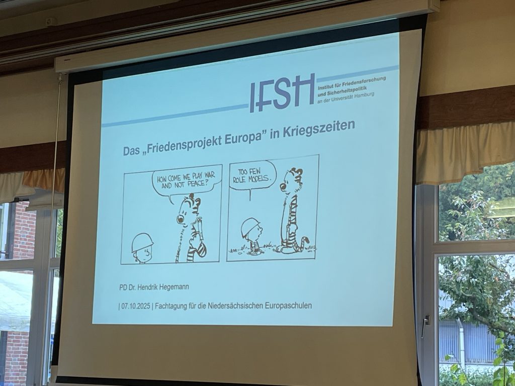 Heute sind wir ins Haags-Hotel Niedersachsenhof in Verden (Aller) gefahren zu der diesjährige Fachtagung der Niedersächsischen Europaschulen. Unter dem Leitthema „Das Friedensprojekt Europa in Zeiten des Krieges“ kamen Lehrkräfte, Koordinatorinnen und Koordinatoren der Europaschulen sowie Vertreterinnen und Vertreter des Niedersächsischen Kultusministeriums und des Niedersächsischen Landesinstituts für schulische Qualitätsentwicklung (NLQ) zusammen, um über die Rolle der Europabildung in einer zunehmend herausfordernden Zeit zu diskutieren.