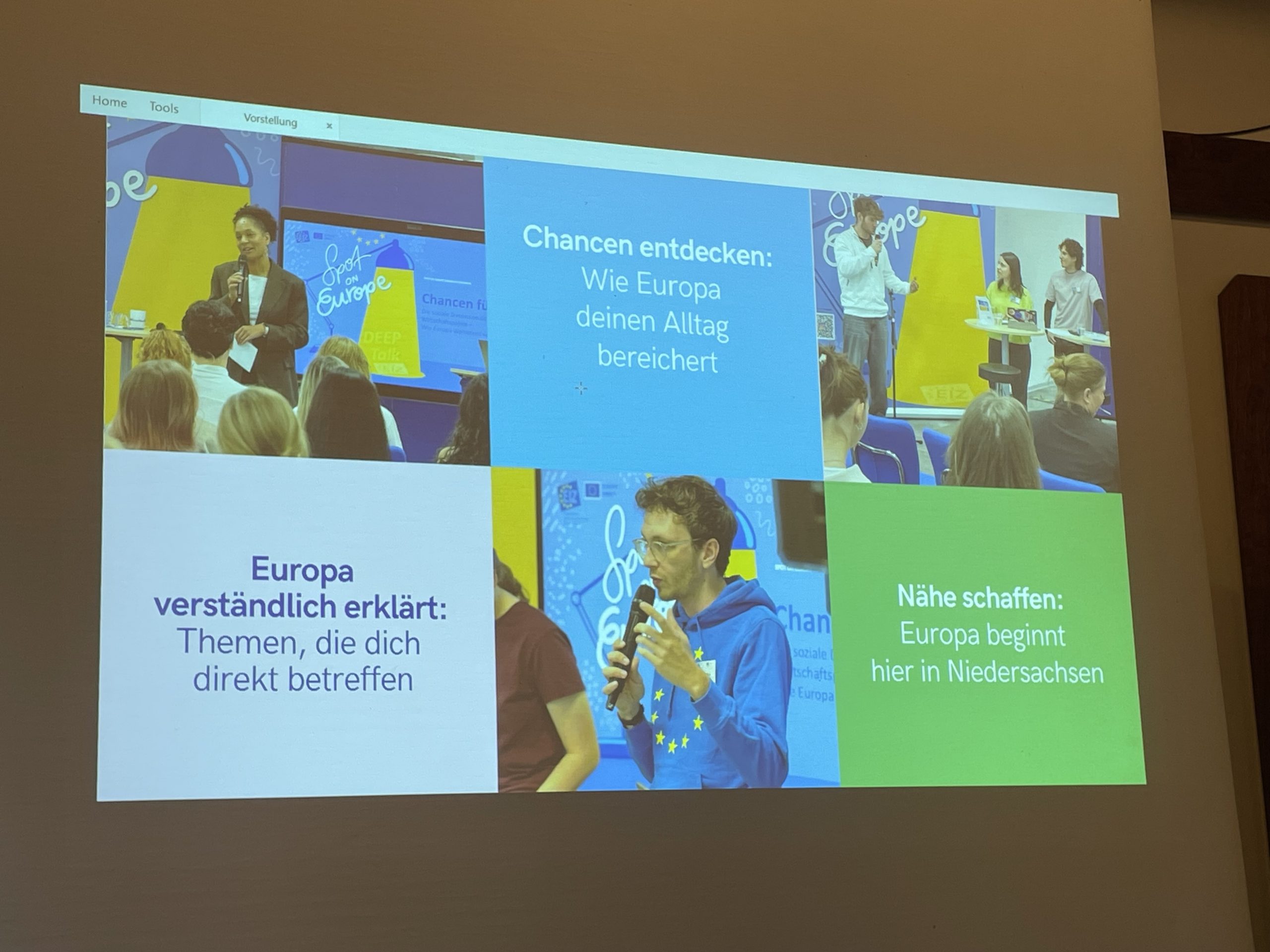 Heute sind wir ins Haags-Hotel Niedersachsenhof in Verden (Aller) gefahren zu der diesjährige Fachtagung der Niedersächsischen Europaschulen. Unter dem Leitthema „Das Friedensprojekt Europa in Zeiten des Krieges“ kamen Lehrkräfte, Koordinatorinnen und Koordinatoren der Europaschulen sowie Vertreterinnen und Vertreter des Niedersächsischen Kultusministeriums und des Niedersächsischen Landesinstituts für schulische Qualitätsentwicklung (NLQ) zusammen, um über die Rolle der Europabildung in einer zunehmend herausfordernden Zeit zu diskutieren.