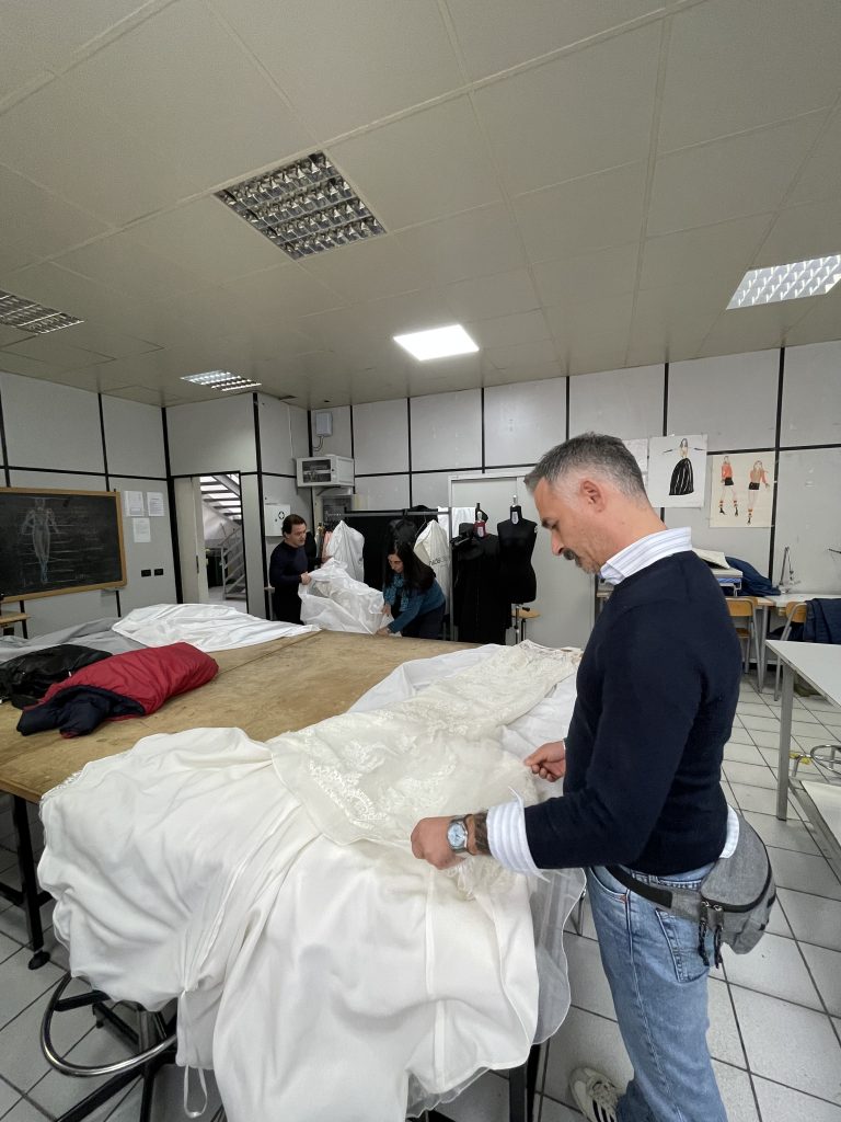 In der Modeschneiderei bekamen wir verschiedene Werke der Schülerinnen und Schüler präsentiert, selbst entworfene und angefertigte Ballkleider, die zum Beispiel vom Theater angefragt werden können. Die Kreativität und handwerkliche Präzision der Schülerinnen und Schüler beeindruckte uns sehr. Besonders motivierend ist für sie, dass sie ihre eigenen Entwürfe bei einer abschließenden Modeschau präsentieren dürfen und dabei in die Rolle von Models schlüpfen.