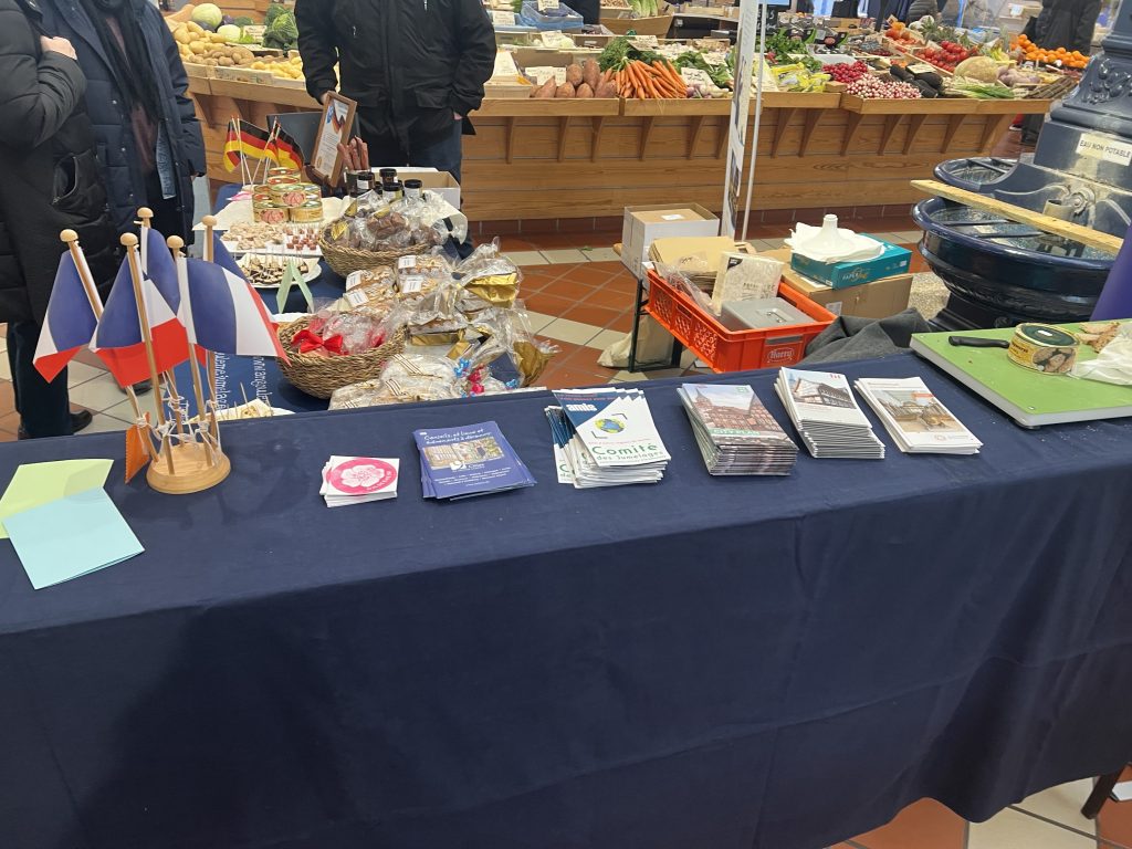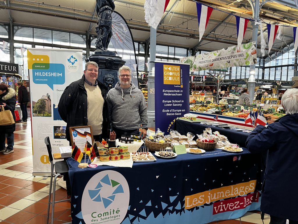Am 29. November waren wir in der Markthalle von Angoulême. Dort haben wir an einem kleinen Verkaufsstand verschiedene Produkte aus Hildesheim und der Region präsentiert und verkauft. Im Angebot waren Christstollen aus unserer Schule, Hildesheimer Pumpernickel, Baumkuchen vom Café Beste, Hildesheimer himmlische Trüffel und Wurstwaren vom Klein Berliner Hof. Prospekt aus unserer schönen Stadt waren in französischer Sprache natürlich auch dabei.