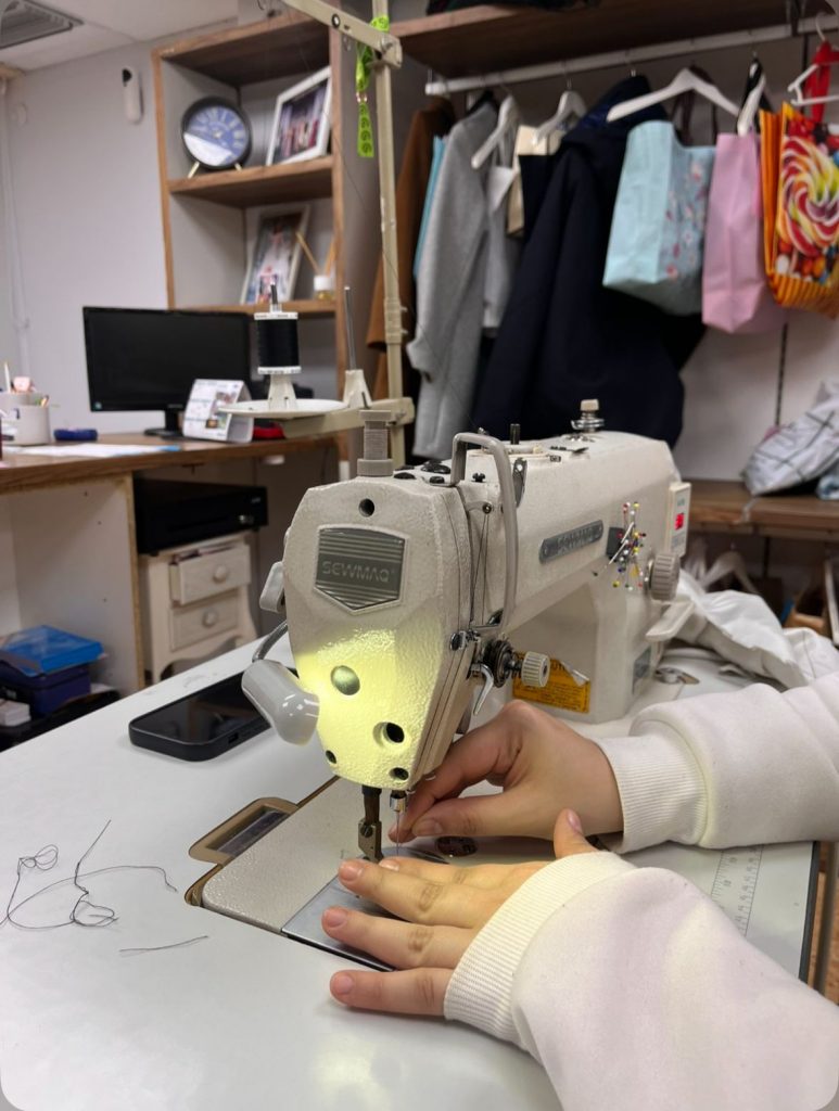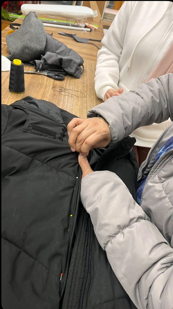 In der Schneiderei wurden wir freundlich begrüßt. Alle waren sehr nett und verständnisvoll zu uns. Auch wenn wir uns sprachlich nicht immer direkt verstanden haben, konnten wir gut mit dem Google Übersetzer kommunizieren. Unsere Aufgaben wurden aufgeteilt: Ich war zwischendurch an der Nähmaschine, später waren Rawan und Kurt dran.