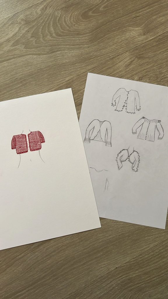 Später ging es dann richtig in Richtung High-Fashion. Wir sollten online eine Dior-Jacke aussuchen und sie mit den auffälligen Bolero-Elementen von John Galliano kombinieren. Das war zunächst ziemlich ungewohnt, denn es ging nicht darum, einfach etwas nachzumachen, sondern zwei ganz unterschiedliche Stile miteinander zu verbinden.