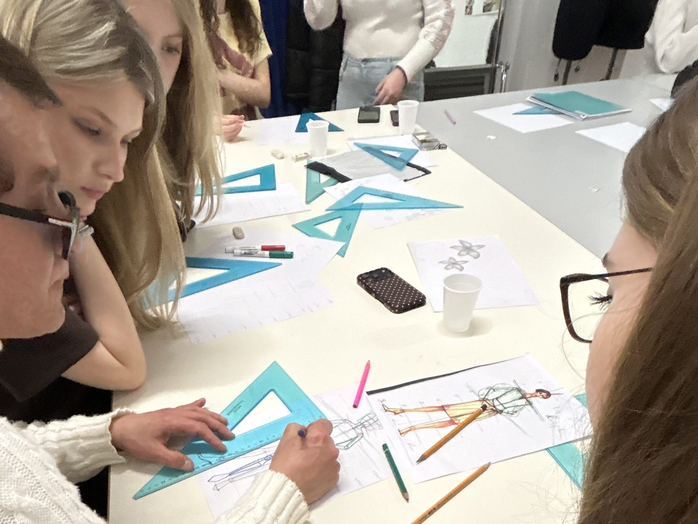 Danach wurde es nochmal richtig spannend, weil wir uns mit dem menschlichen Körper im Bereich Mode beschäftigt haben. Wir haben eine typische Modefigur gezeichnet also so eine Figur, wie Designer sie benutzen, um später ihre Kleidung und Designs darauf zu entwerfen. Am Ende sah es richtig professionell aus, fast wie die Skizzen, die man aus Fashion-Zeitschriften kennt. Besonders interessant war, dass wir es dieses Mal anders gelernt haben als in Deutschland. Die italienischen Schüler und Lehrkräfte haben uns neue Methoden gezeigt, mit denen man Proportionen einfacher aufbauen kann. Dadurch wirkte die Figur viel harmonischer und eleganter. Es war spannend zu sehen, wie schnell aus einfachen Linien eine richtige Fashion-Skizze entsteht.