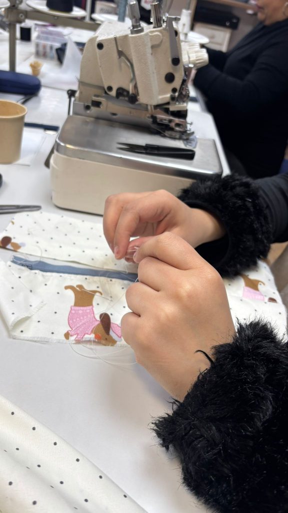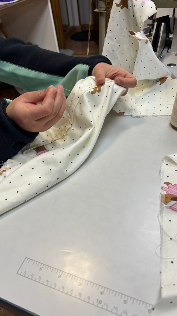 Im Praktikum angekommen, haben wir zuerst unsere letzten Sachen fertig genäht. Es war ein gutes Gefühl, die Projekte, an denen wir gearbeitet haben, noch einmal abzuschließen. Gleichzeitig war dieser Tag auch unser großer Fotoshooting-Tag. Ein Fotograf kam vorbei, um Bilder von uns bei der Arbeit zu machen.