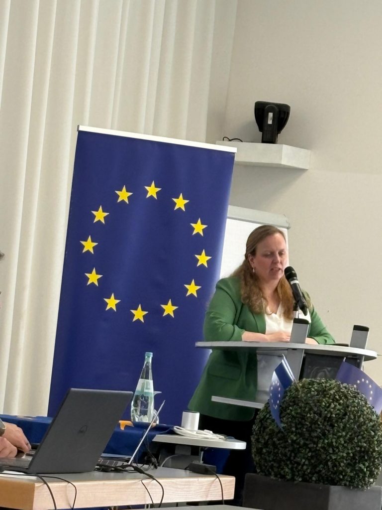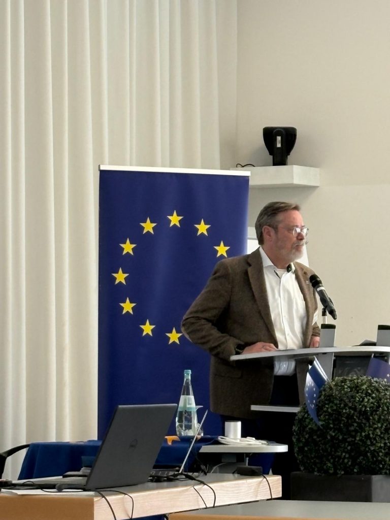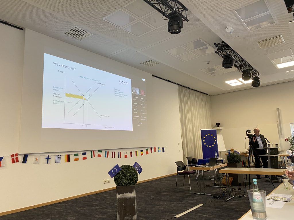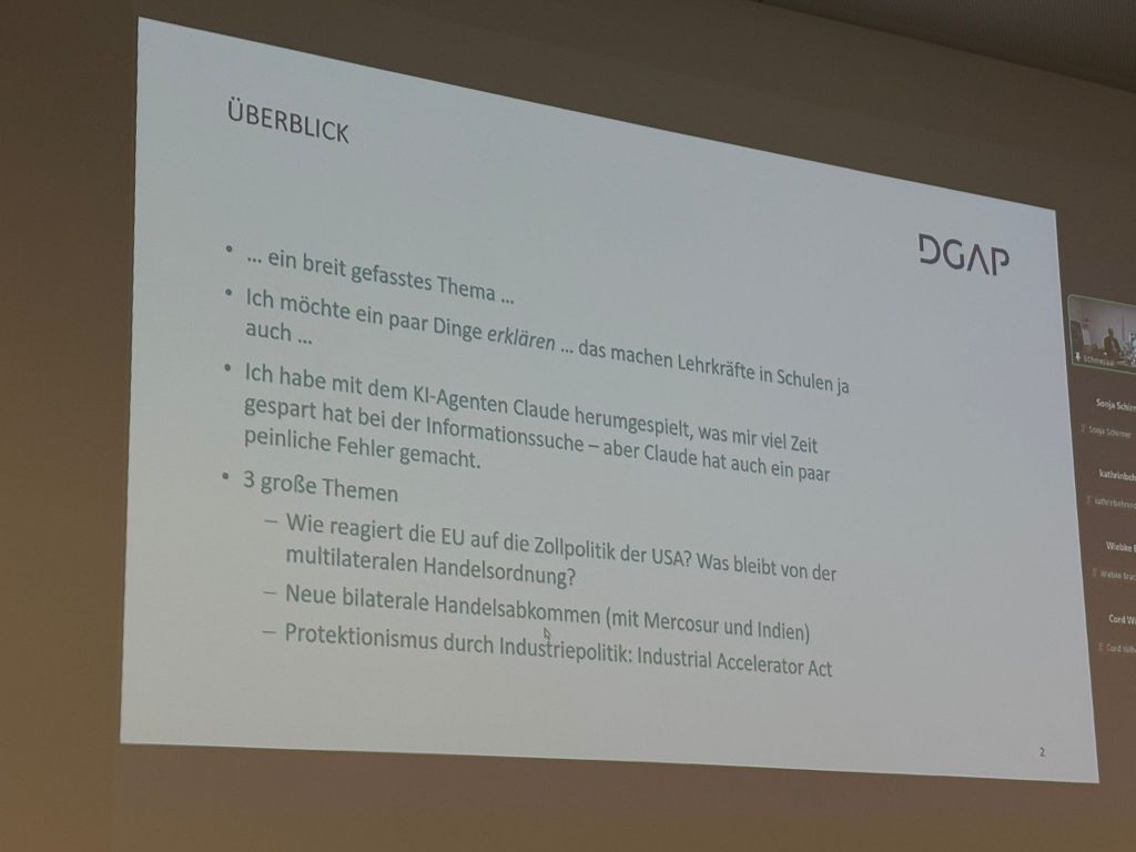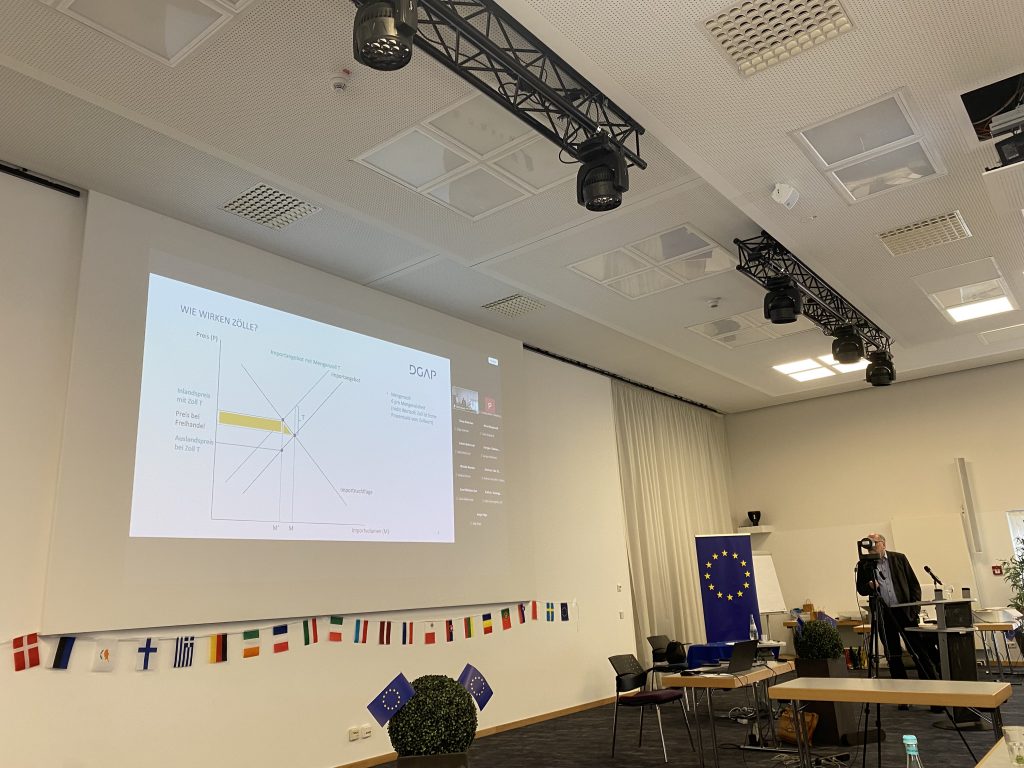 Ein besonderer Programmpunkt des Vormittags war der Vortrag von Matthias Lücke vom Institut für Weltwirtschaft Kiel. In seinem Beitrag beleuchtete er aktuelle Entwicklungen und zentrale Herausforderungen der globalen Handelspolitik der Europäischen Union mit besonderem Blick auf die USA. Die anschließende Diskussion zeigte, wie stark wirtschaftspolitische Themen mit europäischer Bildung und internationaler Zusammenarbeit verknüpft sind. Die Teilnehmenden nutzten die Gelegenheit, Fragen zu stellen und unterschiedliche Perspektiven einzubringen.