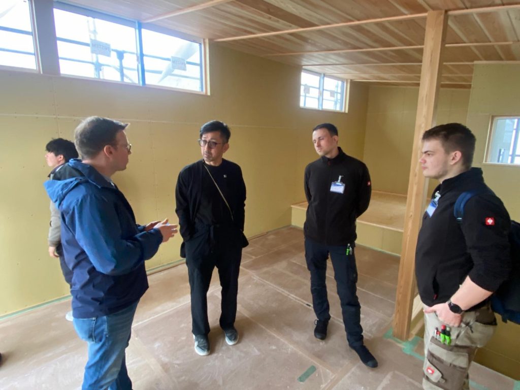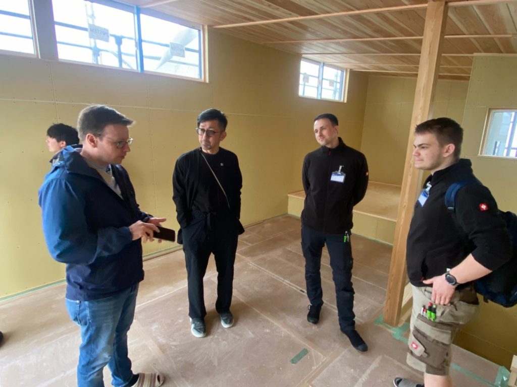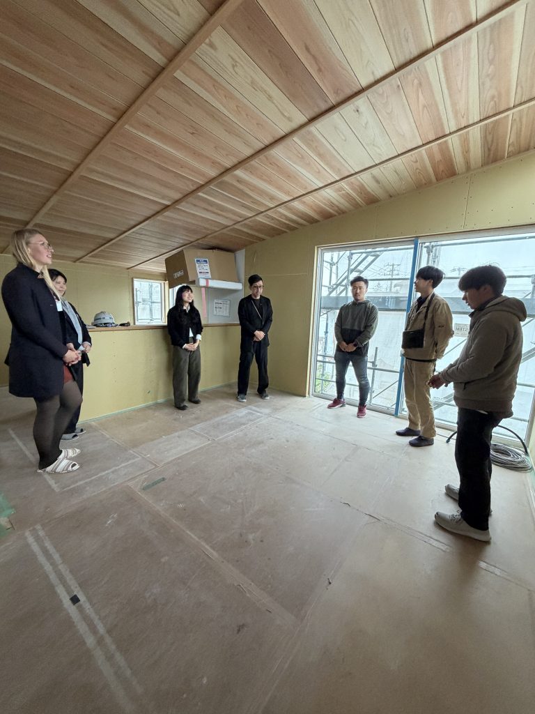 Ein echtes Highlight war die Besichtigung einer aktuellen Baustelle von Kosuke Ono-san von Kenchikokubou Zero. Besonders spannend war, dass wir nicht nur zuschauen, sondern direkt Teil der Abnahme eines Bauabschnitts sein durften. Dieses Treffen wird in Japan „Test“ genannt. Beeindruckend war für uns vor allem die Genauigkeit, mit der gearbeitet wird. Gemeinsam mit den Bauherren gingen die Mitarbeitenden jeden Bereich sorgfältig durch, hielten selbst kleinste Details digital fest und besprachen anschließend alle Punkte gemeinsam. Auffällig war auch, dass bei diesem Termin immer der Chef persönlich anwesend sein muss, ein Zeichen für Verantwortung und Wertschätzung gegenüber den Bauherren.