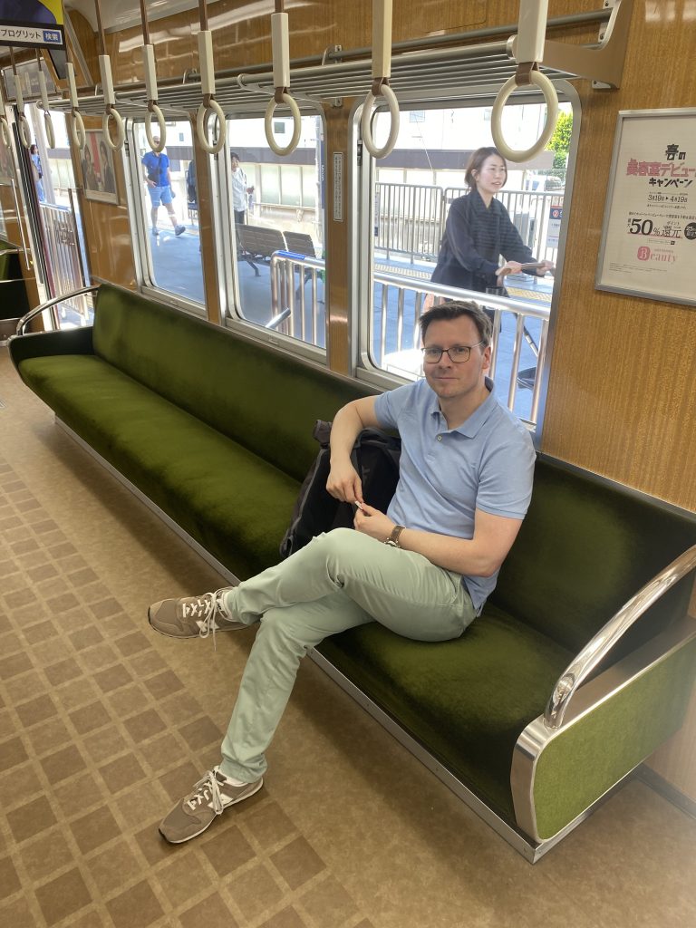 Im Rahmen unseres Austauschs durften wir ein ganz besonderes Treffen in Minoh, nahe Osaka, erleben, denn wir waren zu Gast bei Hiroaki Ukita-san, dem Inhaber des charmanten Restaurants und Cafés Yuzuya. Eingebettet in eine wunderschöne Tempelanlage und in unmittelbarer Nähe eines beeindruckenden Wasserfalls bietet dieser Ort eine einzigartige Atmosphäre, die Tradition, Natur und Gastfreundschaft auf besondere Weise verbindet. Um dort hin zu gelangen muss man ab dem Bahnhof in Osaka mit einem traditionellen Hanyu-Zug fahren, ein besonderes Erlebnis!
