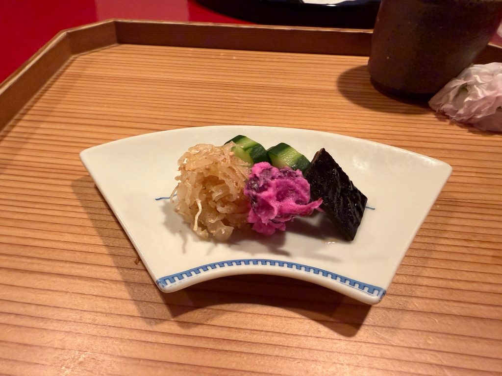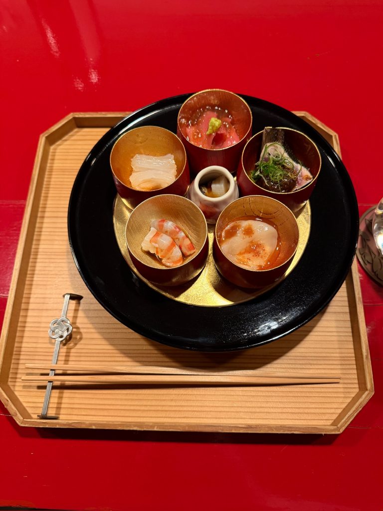 Ein weiterer besonderer Aspekt war die Zubereitung vor uns als Gästen. Ganz im Sinne der japanischen Tradition wurden kleine, fein abgestimmte Speisen serviert, die nicht nur geschmacklich überzeugten, sondern auch optisch an die Leichtigkeit der Kirschblüten erinnerten. Besonders die moderne Interpretation der traditionellen japanischen Speisen macht einfach Freude und ist ein besonderes Erlebnis! Diese Form des Genusses fördert den Austausch und schafft eine Atmosphäre, in der Gemeinschaft spürbar wird. Dabei ist der Koch im Mittelpunkt und geht direkt in die Interaktion mit seinen Gästen. Dies ist eine sehr schöne Art das Kochen für beide Seiten zu einem Erlebnis zu machen. Es ist ein besonderer Aspekt, der in der deutschen Küchentradition oft zu kurz kommt und wo wir von der japanischen Kultur sehr gerne etwas dazulernen! Natürlich möchten wir das großartige Menü nicht vorenthalten, sodass wir alle Gänge der Reihe nach als Bilderreihe präsentieren: