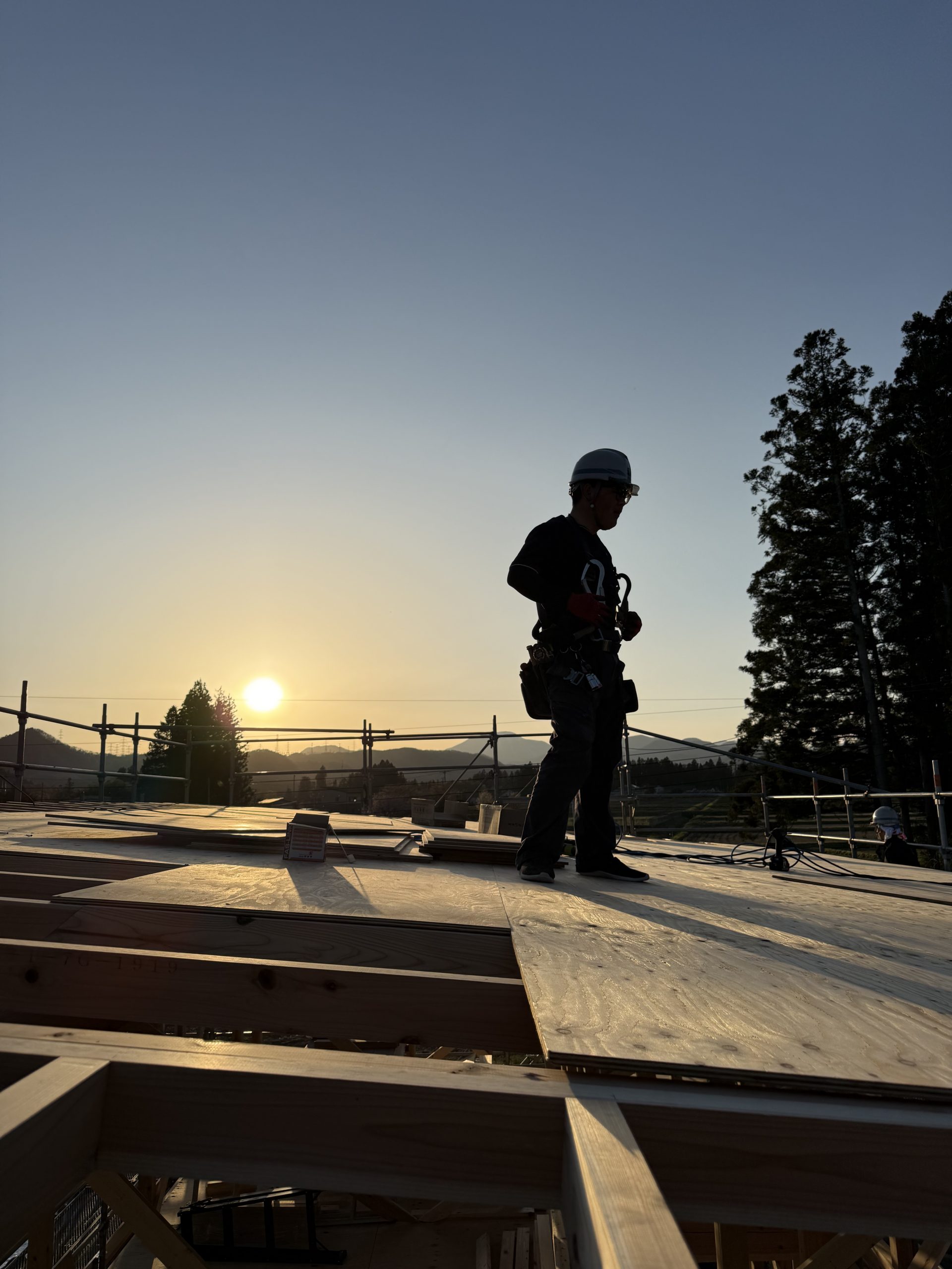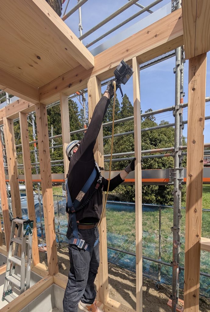 Schnell haben wir den Dreh jedoch raus und schlagen uns im Vergleich mit unseren japanischen Kollegen gar nicht mal so schlecht. Das bleibt nicht unbemerkt, so dass wir zeitig die Nagelpistole in die Hand gedrückt bekommen um damit die Ständer mit dem Rehm zu verbinden. Unter der Anleitung von Toychi arbeiten Dutzende Tischler und Zimmerer zusammen und in Windeseile kann die Decke der ersten Etage gesetzt werden. Vor uns das Gebirge, seitlich der Bambuswald und um uns herum die japanischen Kollegen: Wir realisieren einmal mehr wie besonders und surreal dieser Moment ist.