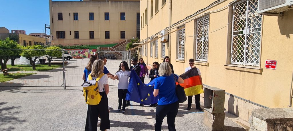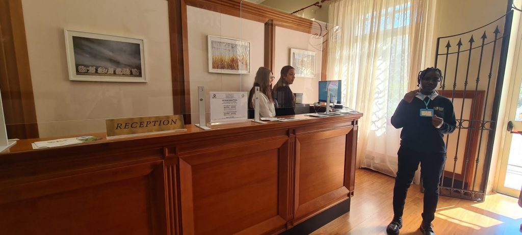 Am nächsten Morgen fuhren wir dann zur Main School in Trapani. Die Schülerinnen und Schüler der Schule warteten schon auf uns und begrüßten uns mit viel Herzlichkeit. Gleich im Eingangsbereich empfing uns eine Schülerin an einer eigens eingerichteten Rezeption. Diese wird täglich von einzelnen Schülerinnen und Schülern besetzt. Hier melden sich Besuchende an. Lehrkräfte und Schülerinnen und Schüler bezahlen hier auch Getränke und Snacks, die sie im benachbarten Bistro erstehen können. Auch das Bistro wird durch Schülerinnen und Schüler betrieben.