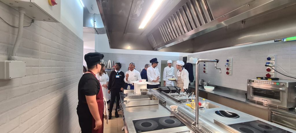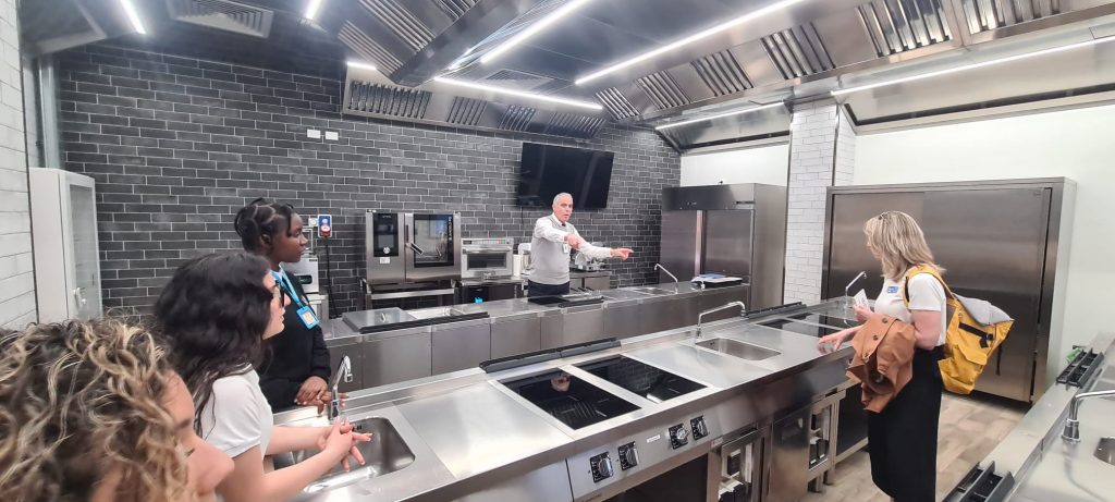 Gebäck und Sandwiches werden in der schuleigenen Patisserie und diverse Küchen hergestellt. Durch diese führten uns die Lernenden. Sie erklärten uns alle Räumlichkeiten in englischer Sprache. In einer Patisserie schauten wir den Lehrkräften und Schülerinnen und Schülern bei der Herstellung leckerer Kuchen zu und halfen bei der Verkostung.