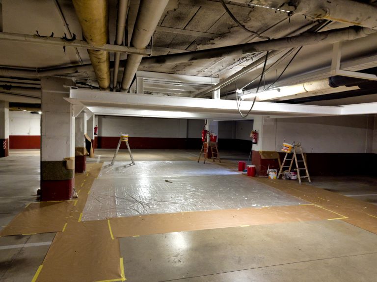 Am Montag morgen ging es wieder runter in die Tiefgarage, denn die dritte und letzte Beschichtung mit Brandschutzfarbe stand an. Nachdem wir damit fertig waren, haben wir die Abdeckfolien entfernt und sind wieder mit dem Fahrstuhl hoch ins Treppenhaus für…