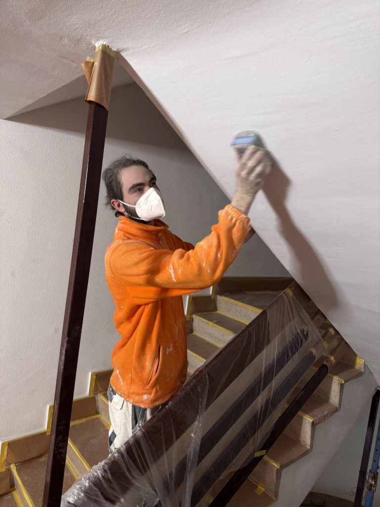 Es ist bereits Donnerstag und wir haben uns mit den Abdeckarbeiten stetig nach unten durchgearbeitet. Jetzt fehlten nur noch Etage 1-3, die wir noch vor der Mittagspause fertiggestellt haben. Nachdem das erledigt war, haben wir mehrere kleine Farbtöpfe in Joghurtbechergröße…